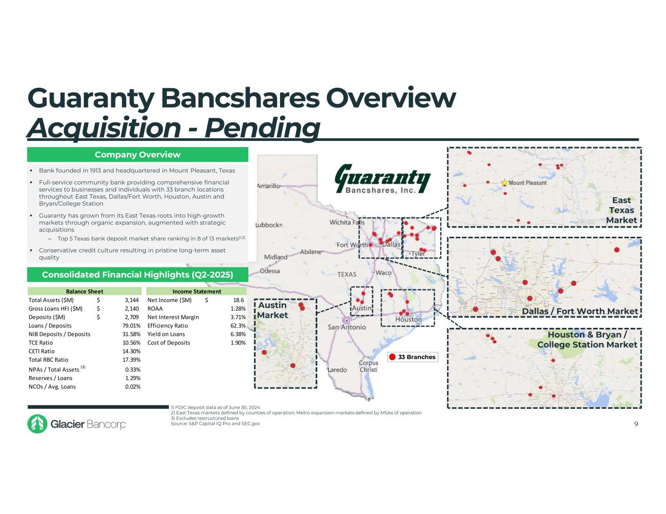 Acquisition – Bank of Idaho Holding Co. (“BOID”) Transaction Overview and Assumptions Consideration Mix  100% stock consideration to BOID common shareholders  1.100x shares of Glacier Bancorp stock for each BOID share  BOID options and stock appreciation rights will be cashed out for their in-the-money value Implied Transaction Value(1)  $234.3 million to common shareholders, or $52.47 per share(2)  $11.0 million to option and stock appreciation rights holders(3)  $245.4 million total transaction value Loan Credit Mark Estimate  Gross credit mark discount of $14.2 million, or 1.41% of BOID’s gross loans  95% allocated to non-PCD loans, or $13.5 million  Non-PCD credit mark accreted over 5 years using the sum-of-years’ digits methodology  Establishment of CECL reserve for non-PCD loans of $13.5 million, reflected in pro forma TBV at closing Other Adjustments and Fair Value Estimates  Loan interest rate mark premium of $3.2 million, or 0.32% of BOID’s gross loans, amortized over 5 years using the sum-of-years’ digits methodology  Core deposit intangible of 1.75%, or $15.5 million, amortized over 10 years using the sum-of-years’ digits methodology  Elimination of BOID’s AOCI of $(9.4) million, accreted over 6 years using the sum-of-years’ digits methodology  Fixed asset write-up of $3.3 million; amortized over 20 years straight-line  Net fair value adjustment of $0.4 million for CDs and subordinated debt combined Cost Savings  Cost savings of 30.0% of BOID’s non-interest expense  30.0% realized in 2025, 80.0% realized in 2026 and 100.0% thereafter Durbin Impact  Estimated reduction of BOID’s interchange income by approximately $0.5 million annually, pre-tax Transaction Expenses(4)  Estimated one-time transaction costs of approximately $17.7 million, pre-tax Price Protection  Fixed exchange ratio with collars set between $35.74 and $53.60 (+/- 20% from GBCI stock price in LOI) Minimum Tangible Equity  $122.1 million at closing  Excess tangible common equity, net of any adjustments for BOID’s final transaction expenses, to be paid out to BOID shareholders at closing Acquisition Date  April 30, 2025 (1) Based on GBCI closing price of $47.70 on 1/10/2025 (2) Includes 4,420,332 BOID shares and 45,413 RSUs which will vest at closing (3) Includes 370,725 options with a weighted average exercise price of $24.87 and 24,291 SARs with a weighted average grant price of $19.08 (4) Including employment and benefit plan costs, data contract termination and conversion costs and combined professional and advisory fees 8