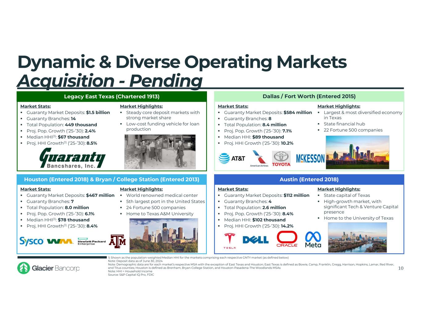 Guaranty Bancshares Overview Acquisition - Pending 9 Consolidated Financial Highlights (Q2-2025) Company Overview  Bank founded in 1913 and headquartered in Mount Pleasant, Texas  Full-service community bank providing comprehensive financial services to businesses and individuals with 33 branch locations throughout East Texas, Dallas/Fort Worth, Houston, Austin and Bryan/College Station  Guaranty has grown from its East Texas roots into high-growth markets through organic expansion, augmented with strategic acquisitions ‒ Top 5 Texas bank deposit market share ranking in 8 of 13 markets(1,2)  Conservative credit culture resulting in pristine long-term asset quality 1) FDIC deposit data as of June 30, 2024 2) East Texas markets defined by counties of operation; Metro expansion markets defined by MSAs of operation 3) Excludes restructured loans Source: S&P Capital IQ Pro and SEC.gov Dallas / Fort Worth Market Austin Market Houston & Bryan / College Station Market East Texas Market 33 Branches Total Assets ($M) 3,144$ Net Income ($M) 18.6$ Gross Loans HFI ($M) 2,140$ ROAA 1.28% Deposits ($M) 2,709$ Net Interest Margin 3.71% Loans / Deposits 79.01% Efficiency Ratio 62.3% NIB Deposits / Deposits 31.58% Yield on Loans 6.38% TCE Ratio 10.56% Cost of Deposits 1.90% CETI Ratio 14.30% Total RBC Ratio 17.39% NPAs / Total Assets (3) 0.33% Reserves / Loans 1.29% NCOs / Avg. Loans 0.02% Balance Sheet Income Statement