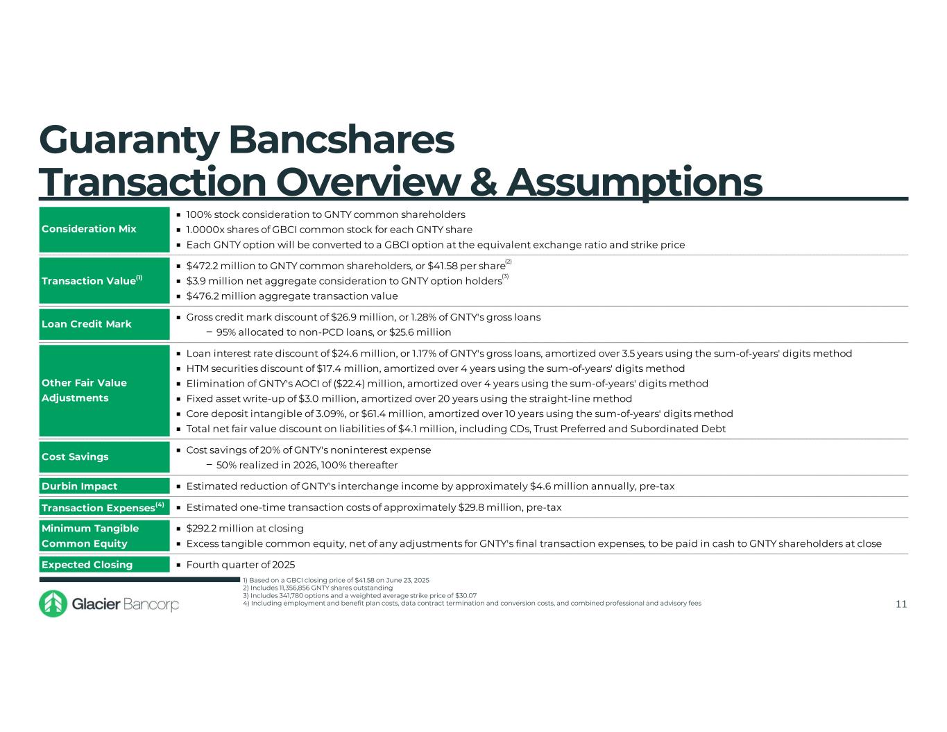 Dynamic & Diverse Operating Markets Acquisition - Pending 10 Legacy East Texas (Chartered 1913) Market Stats:  Guaranty Market Deposits: $1.5 billion  Guaranty Branches: 14  Total Population: 449 thousand  Proj. Pop. Growth (‘25-’30): 2.4%  Median HHI(1): $67 thousand  Proj. HHI Growth(1) (‘25-’30): 8.5% Dallas / Fort Worth (Entered 2015) Houston (Entered 2018) & Bryan / College Station (Entered 2013) Austin (Entered 2018) Market Highlights:  Steady core deposit markets with strong market share  Low-cost funding vehicle for loan production Market Stats:  Guaranty Market Deposits: $584 million  Guaranty Branches: 8  Total Population: 8.4 million  Proj. Pop. Growth (‘25-’30): 7.1%  Median HHI: $89 thousand  Proj. HHI Growth (‘25-’30): 10.2% Market Highlights:  Largest & most diversified economy in Texas  State financial hub  22 Fortune 500 companies Market Stats:  Guaranty Market Deposits: $467 million  Guaranty Branches: 7  Total Population: 8.0 million  Proj. Pop. Growth (‘25-’30): 6.1%  Median HHI(1): $78 thousand  Proj. HHI Growth(1) (‘25-’30): 8.4% Market Highlights:  World renowned medical center  5th largest port in the United States  24 Fortune 500 companies  Home to Texas A&M University Market Stats:  Guaranty Market Deposits: $112 million  Guaranty Branches: 4  Total Population: 2.6 million  Proj. Pop. Growth (‘25-’30): 8.4%  Median HHI: $102 thousand  Proj. HHI Growth (‘25-’30): 14.2% Market Highlights:  State capital of Texas  High-growth market, with significant Tech & Venture Capital presence  Home to the University of Texas 1) Shown as the population-weighted Median HHI for the markets comprising each respective GNTY market (as defined below) Note: Deposit data as of June 30, 2024 Note: Demographic data are for each market’s respective MSA with the exception of East Texas and Houston; East Texas is defined as Bowie, Camp, Franklin, Gregg, Harrison, Hopkins, Lamar, Red River, and Titus counties; Houston is defined as Brenham, Bryan-College Station, and Houston-Pasadena-The Woodlands MSAs Note: HHI = Household Income Source: S&P Capital IQ Pro, FDIC