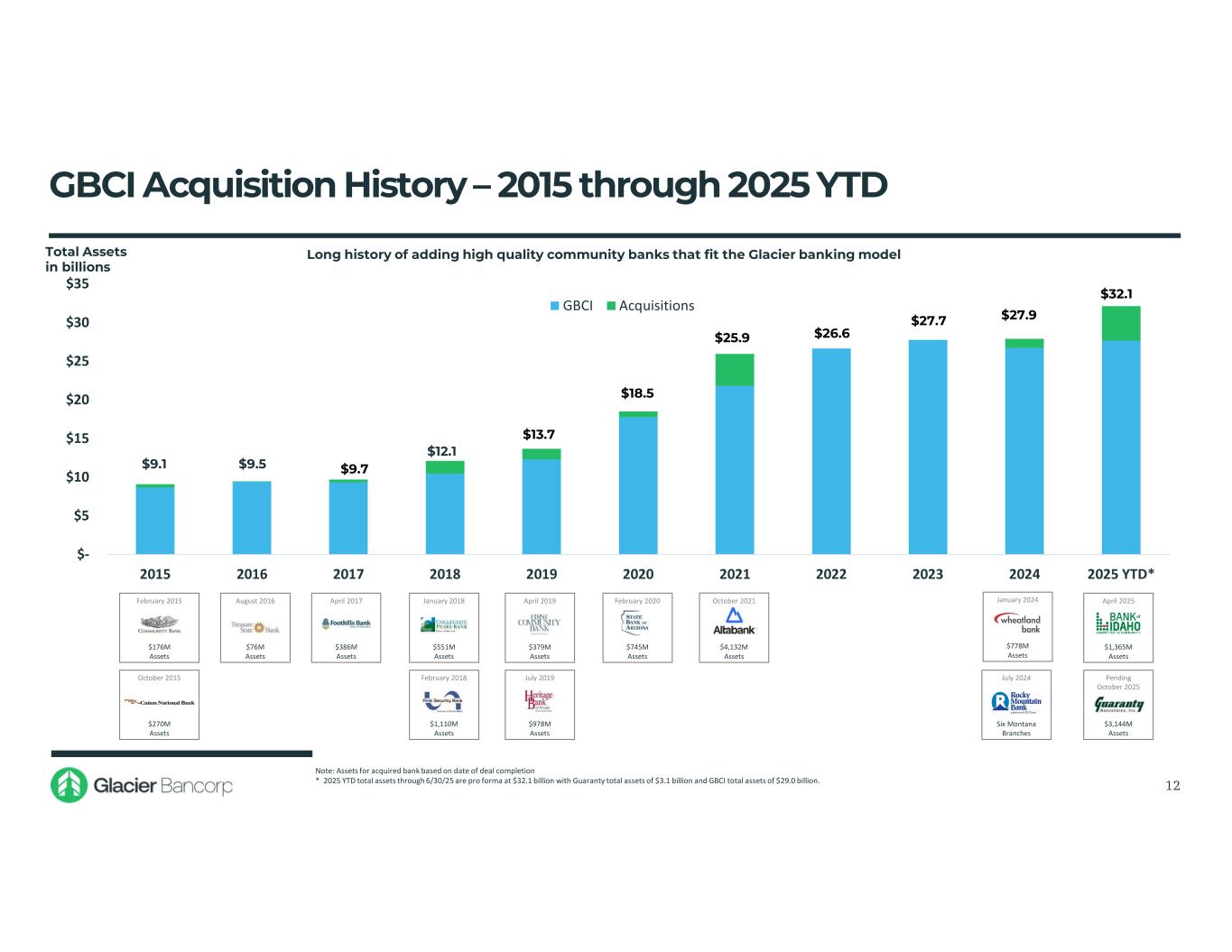 Guaranty Bancshares Transaction Overview & Assumptions 11 ▪ 100% stock consideration to GNTY common shareholders ▪ 1.0000x shares of GBCI common stock for each GNTY share ▪ Each GNTY option will be converted to a GBCI option at the equivalent exchange ratio and strike price ▪ $472.2 million to GNTY common shareholders, or $41.58 per share ▪ $3.9 million net aggregate consideration to GNTY option holders ▪ $476.2 million aggregate transaction value ▪ Gross credit mark discount of $26.9 million, or 1.28% of GNTY's gross loans ‒ 95% allocated to non-PCD loans, or $25.6 million ▪ Loan interest rate discount of $24.6 million, or 1.17% of GNTY's gross loans, amortized over 3.5 years using the sum-of-years' digits method ▪ HTM securities discount of $17.4 million, amortized over 4 years using the sum-of-years' digits method ▪ Elimination of GNTY's AOCI of ($22.4) million, amortized over 4 years using the sum-of-years' digits method ▪ Fixed asset write-up of $3.0 million, amortized over 20 years using the straight-line method ▪ Core deposit intangible of 3.09%, or $61.4 million, amortized over 10 years using the sum-of-years' digits method ▪ Total net fair value discount on liabilities of $4.1 million, including CDs, Trust Preferred and Subordinated Debt ▪ Cost savings of 20% of GNTY's noninterest expense ‒ 50% realized in 2026, 100% thereafter Durbin Impact ▪ Estimated reduction of GNTY's interchange income by approximately $4.6 million annually, pre-tax Transaction Expenses(4) ▪ Estimated one-time transaction costs of approximately $29.8 million, pre-tax ▪ $292.2 million at closing ▪ Excess tangible common equity, net of any adjustments for GNTY's final transaction expenses, to be paid in cash to GNTY shareholders at close Expected Closing ▪ Fourth quarter of 2025 Minimum Tangible Common Equity Consideration Mix Transaction Value(1) Loan Credit Mark Other Fair Value Adjustments Cost Savings 1) Based on a GBCI closing price of $41.58 on June 23, 2025 2) Includes 11,356,856 GNTY shares outstanding 3) Includes 341,780 options and a weighted average strike price of $30.07 4) Including employment and benefit plan costs, data contract termination and conversion costs, and combined professional and advisory fees (2) (3)