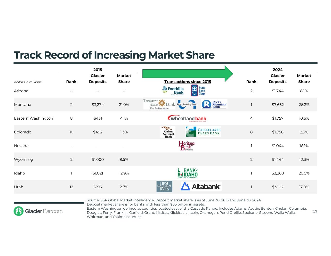 12 $- $5 $10 $15 $20 $25 $30 $35 2015 2016 2017 2018 2019 2020 2021 2022 2023 2024 2025 YTD* GBCI Acquisitions $12.1 $9.7 $13.7 $18.5 $25.9 $26.6 $27.7 $27.9 $32.1 GBCI Acquisition History – 2015 through 2025 YTD Total Assets in billions Long history of adding high quality community banks that fit the Glacier banking model April 2025 $1,365M Assets July 2024 Six Montana Branches February 2015 $176M Assets October 2015 $270M Assets October 2021 $4,132M Assets July 2019 $978M Assets April 2017 $386M Assets April 2019 $379M Assets February 2018 $1,110M Assets January 2018 $551M Assets February 2020 $745M Assets August 2016 $76M Assets January 2024 $778M Assets Pending October 2025 $3,144M Assets Note: Assets for acquired bank based on date of deal completion * 2025 YTD total assets through 6/30/25 are pro forma at $32.1 billion with Guaranty total assets of $3.1 billion and GBCI total assets of $29.0 billion. $9.1 $9.5