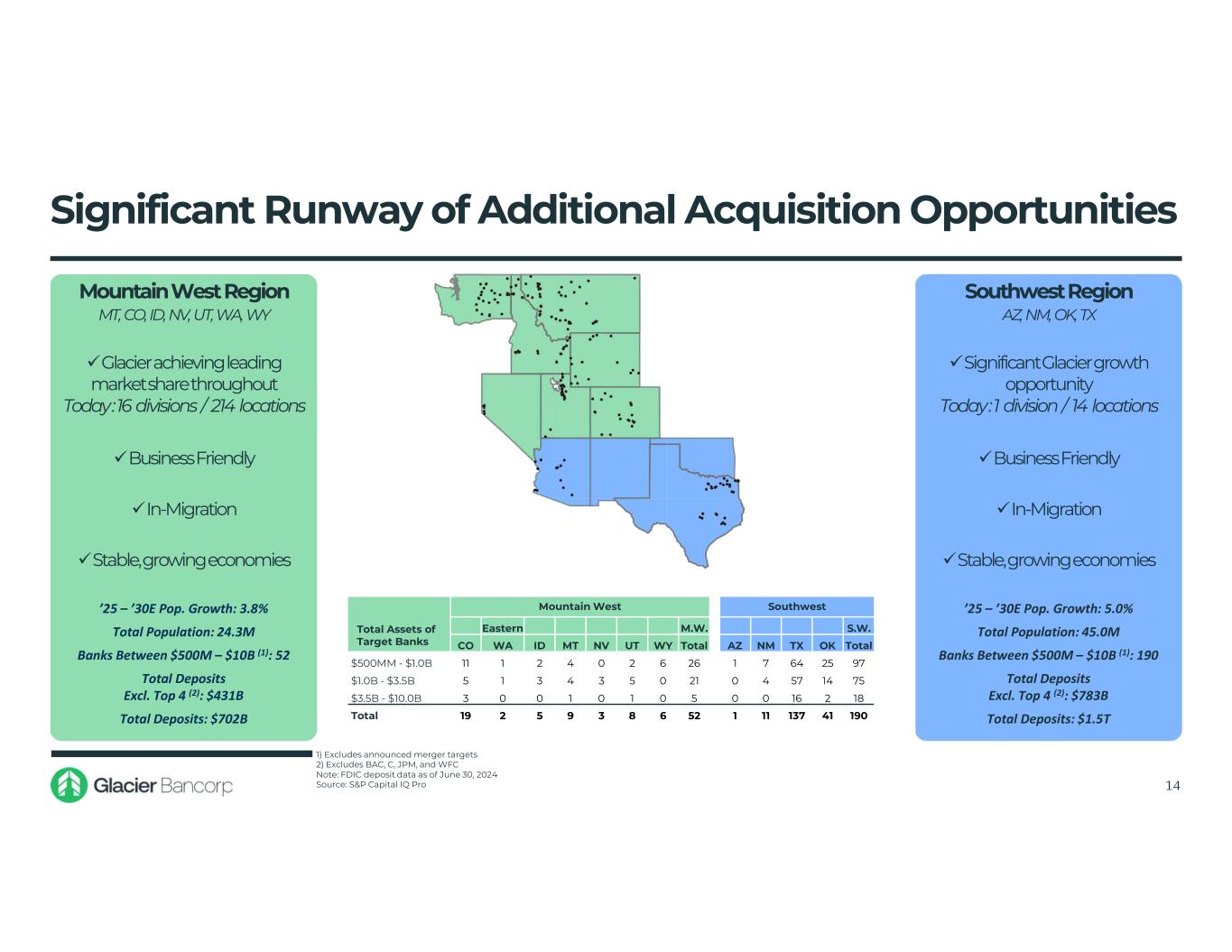 2015 2024 Glacier Market Glacier Market dollars in millions Rank Deposits Share Transactions since 2015 Rank Deposits Share Arizona -- -- -- 2 $1,744 8.1% Montana 2 $3,274 21.0% 1 $7,632 26.2% Eastern Washington 8 $451 4.1% 4 $1,757 10.6% Colorado 10 $492 1.3% 8 $1,758 2.3% Nevada -- -- -- 1 $1,044 16.1% Wyoming 2 $1,000 9.5% 2 $1,444 10.3% Idaho 1 $1,021 12.9% 1 $3,268 20.5% Utah 12 $193 2.7% 1 $3,102 17.0% Track Record of Increasing Market Share Source: S&P Global Market Intelligence. Deposit market share is as of June 30, 2015 and June 30, 2024. Deposit market share is for banks with less than $50 billion in assets. Eastern Washington defined as counties located east of the Cascade Range. Includes Adams, Asotin, Benton, Chelan, Columbia, Douglas, Ferry, Franklin, Garfield, Grant, Kittitas, Klickitat, Lincoln, Okanogan, Pend Oreille, Spokane, Stevens, Walla Walla, Whitman, and Yakima counties. 13