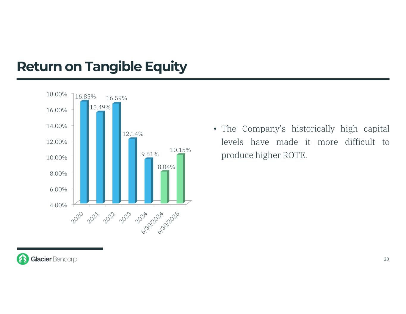 0.20% 0.40% 0.60% 0.80% 1.00% 1.20% 1.40% 1.60% 1.80% 1.62% 0.68% 1.33% 0.81% 0.56% 0.77% • ROA for the second quarter 2025 was 0.77% and ROA of 0.80% for the first quarter 2025 was in the 31st♦ percentile among Glacier’s peer group • ROA of 0.68% for the fourth quarter 2024 was in the 28th percentile among Glacier’s peer group Return on Assets ♦BHCPR as of 3/31/2025 1.15% 19