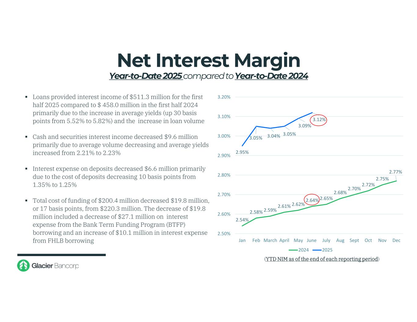 Net Interest Margin Year-to-Date 2025 compared to Year-to-Date 2024 2.54% 2.58% 2.59% 2.61% 2.62% 2.64% 2.65% 2.68% 2.70% 2.72% 2.75% 2.77% 2.95% 3.05% 3.04% 3.05% 3.09% 3.12% 2.50% 2.60% 2.70% 2.80% 2.90% 3.00% 3.10% 3.20% Jan Feb March April May June July Aug Sept Oct Nov Dec 2024 2025 (YTD NIM as of the end of each reporting period)  Loans provided interest income of $511.3 million for the first half 2025 compared to $ 458.0 million in the first half 2024 primarily due to the increase in average yields (up 30 basis points from 5.52% to 5.82%) and the increase in loan volume  Cash and securities interest income decreased $9.6 million primarily due to average volume decreasing and average yields increased from 2.21% to 2.23%  Interest expense on deposits decreased $6.6 million primarily due to the cost of deposits decreasing 10 basis points from 1.35% to 1.25%  Total cost of funding of $200.4 million decreased $19.8 million, or 17 basis points, from $220.3 million. The decrease of $19.8 million included a decrease of $27.1 million on interest expense from the Bank Term Funding Program (BTFP) borrowing and an increase of $10.1 million in interest expense from FHLB borrowing