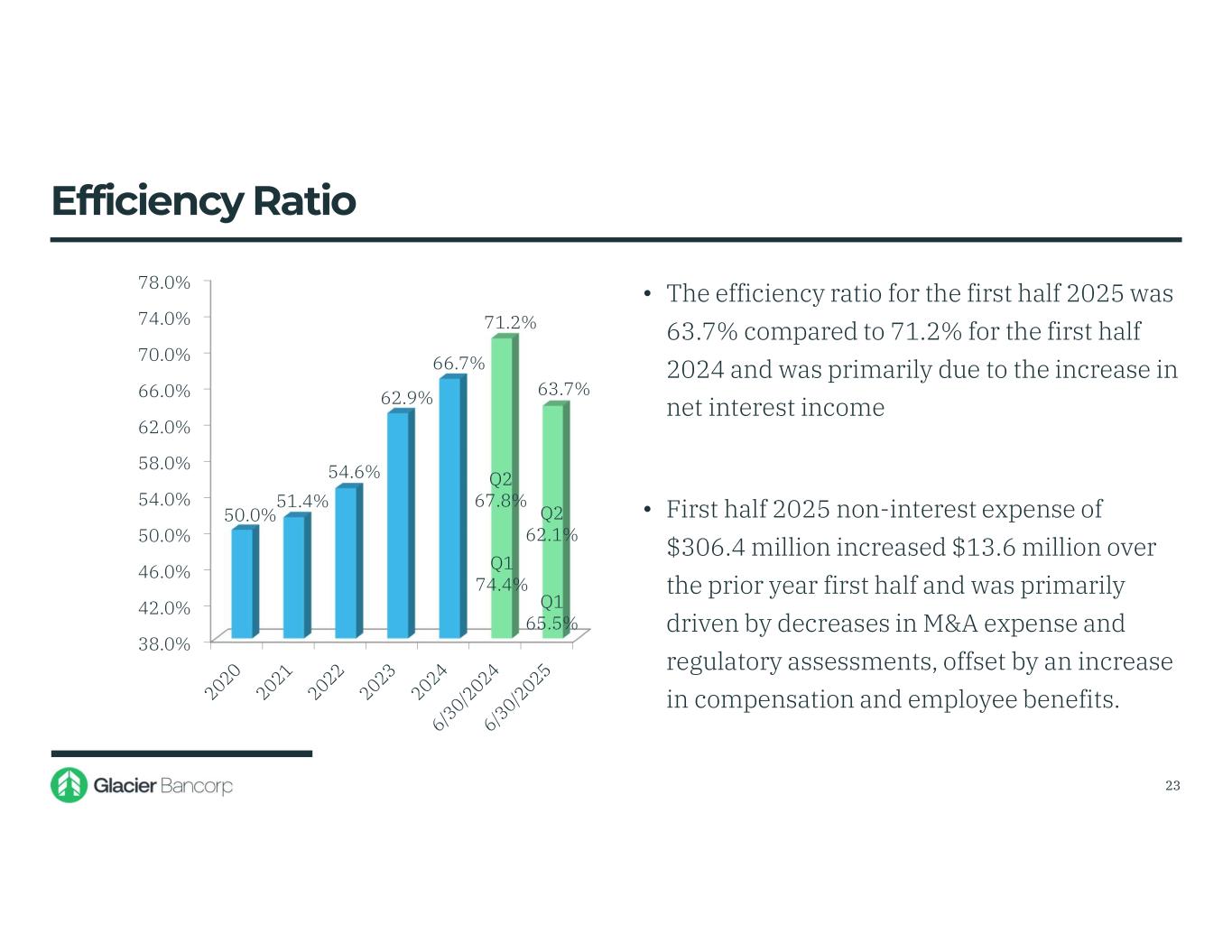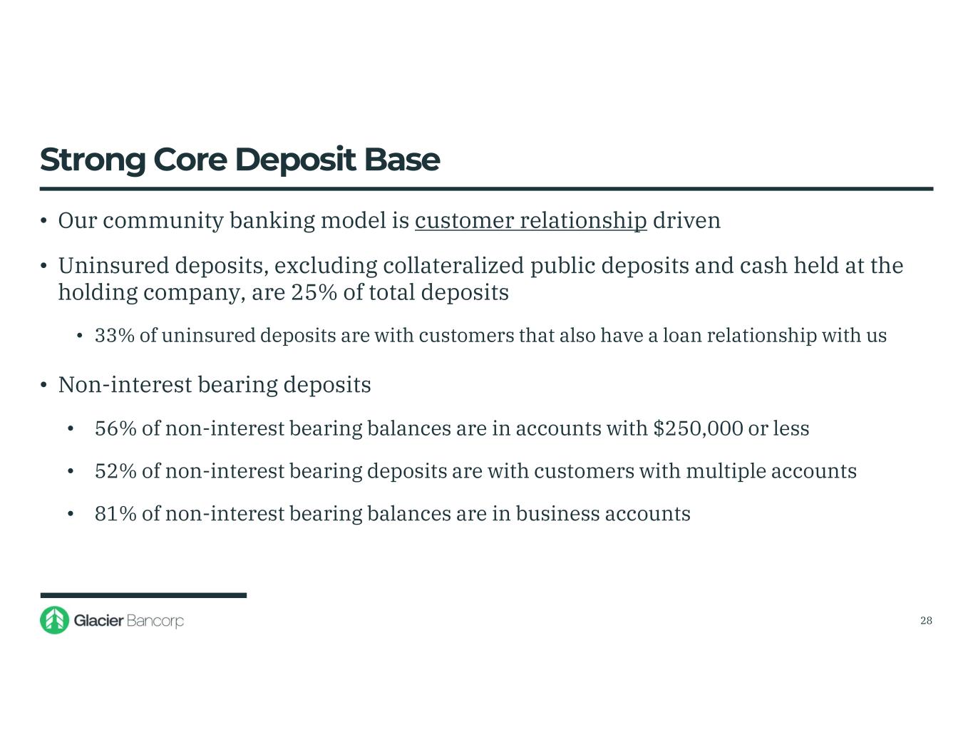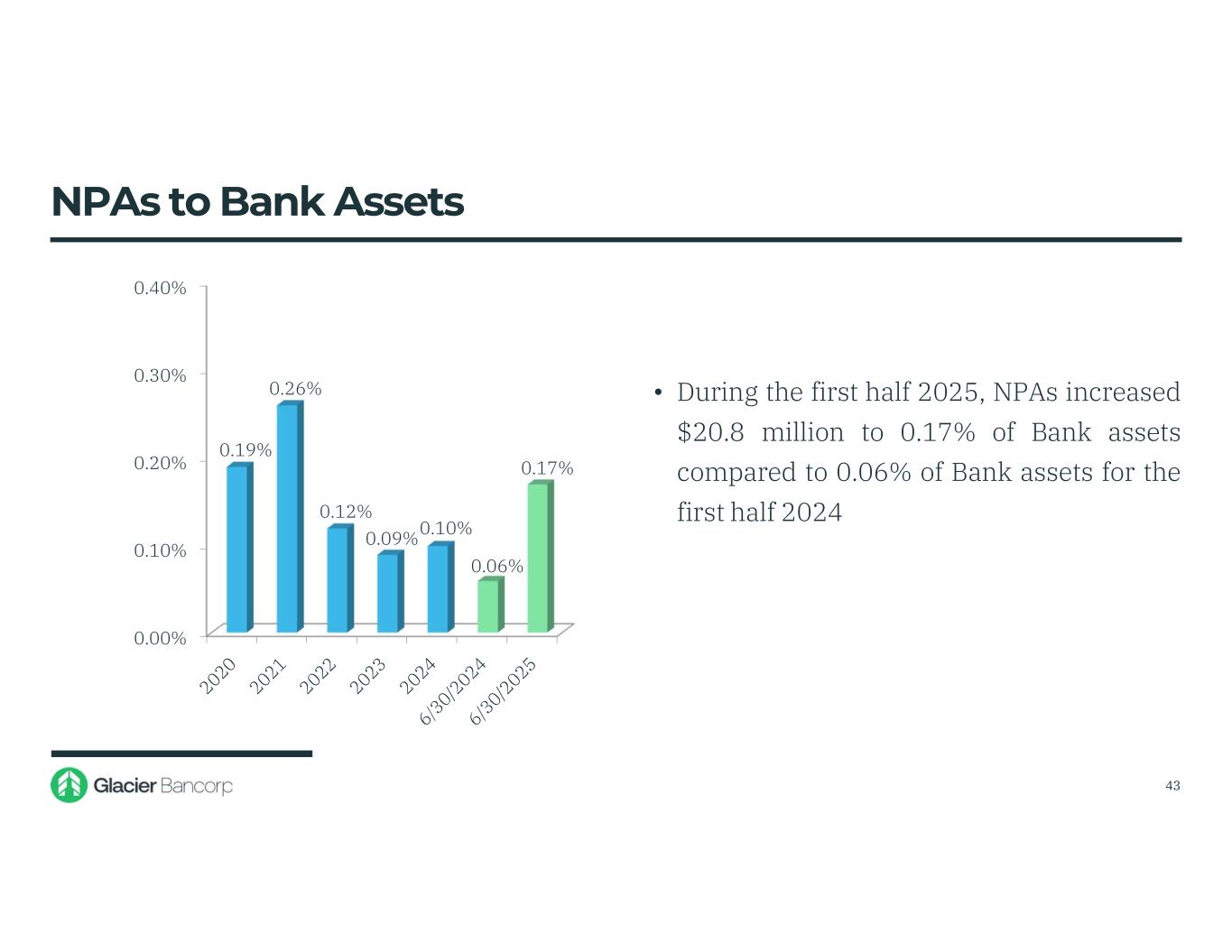 Glacier Bancorp Inc. 6/30/2025 Snapshot Ticker GBCI Total Assets $29.01 billion Gross Loans $18.53 billion Deposits $21.63 billion TCBV Per Share $19.79 Dividends $0.33 Stock Price $43.08 Market Cap $5.11 billion 3