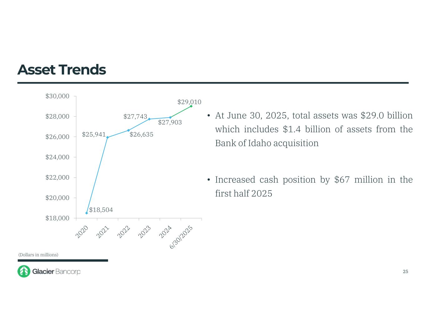 $18,504 $25,941 $26,635 $27,743 $27,903 $29,010 $18,000 $20,000 $22,000 $24,000 $26,000 $28,000 $30,000 • At June 30, 2025, total assets was $29.0 billion which includes $1.4 billion of assets from the Bank of Idaho acquisition • Increased cash position by $67 million in the first half 2025 Asset Trends (Dollars in millions) 25