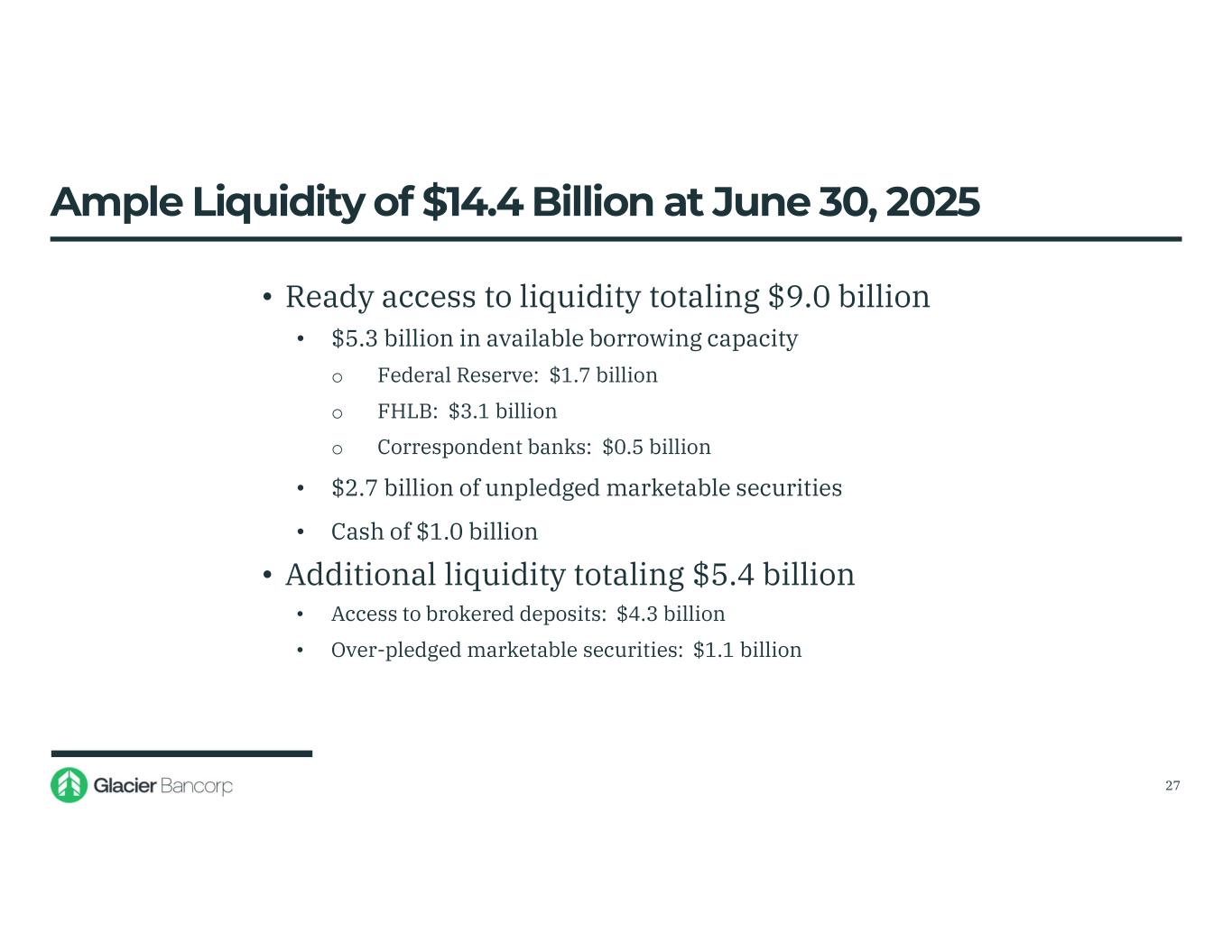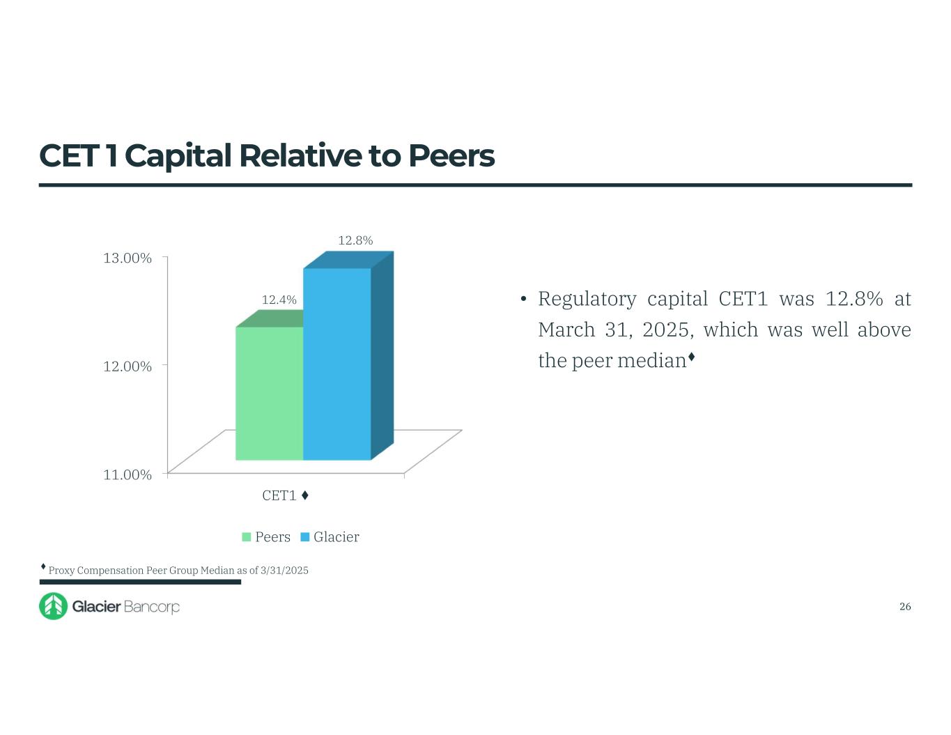11.00% 12.00% 13.00% CET1 ♦ 12.4% 12.8% Peers Glacier • Regulatory capital CET1 was 12.8% at March 31, 2025, which was well above the peer median♦ CET 1 Capital Relative to Peers ♦ Proxy Compensation Peer Group Median as of 3/31/2025 26
