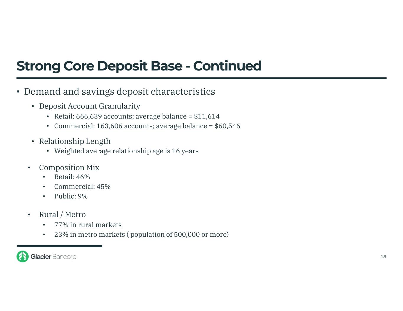 Strong Core Deposit Base • Our community banking model is customer relationship driven • Uninsured deposits, excluding collateralized public deposits and cash held at the holding company, are 25% of total deposits • 33% of uninsured deposits are with customers that also have a loan relationship with us • Non-interest bearing deposits • 56% of non-interest bearing balances are in accounts with $250,000 or less • 52% of non-interest bearing deposits are with customers with multiple accounts • 81% of non-interest bearing balances are in business accounts 28