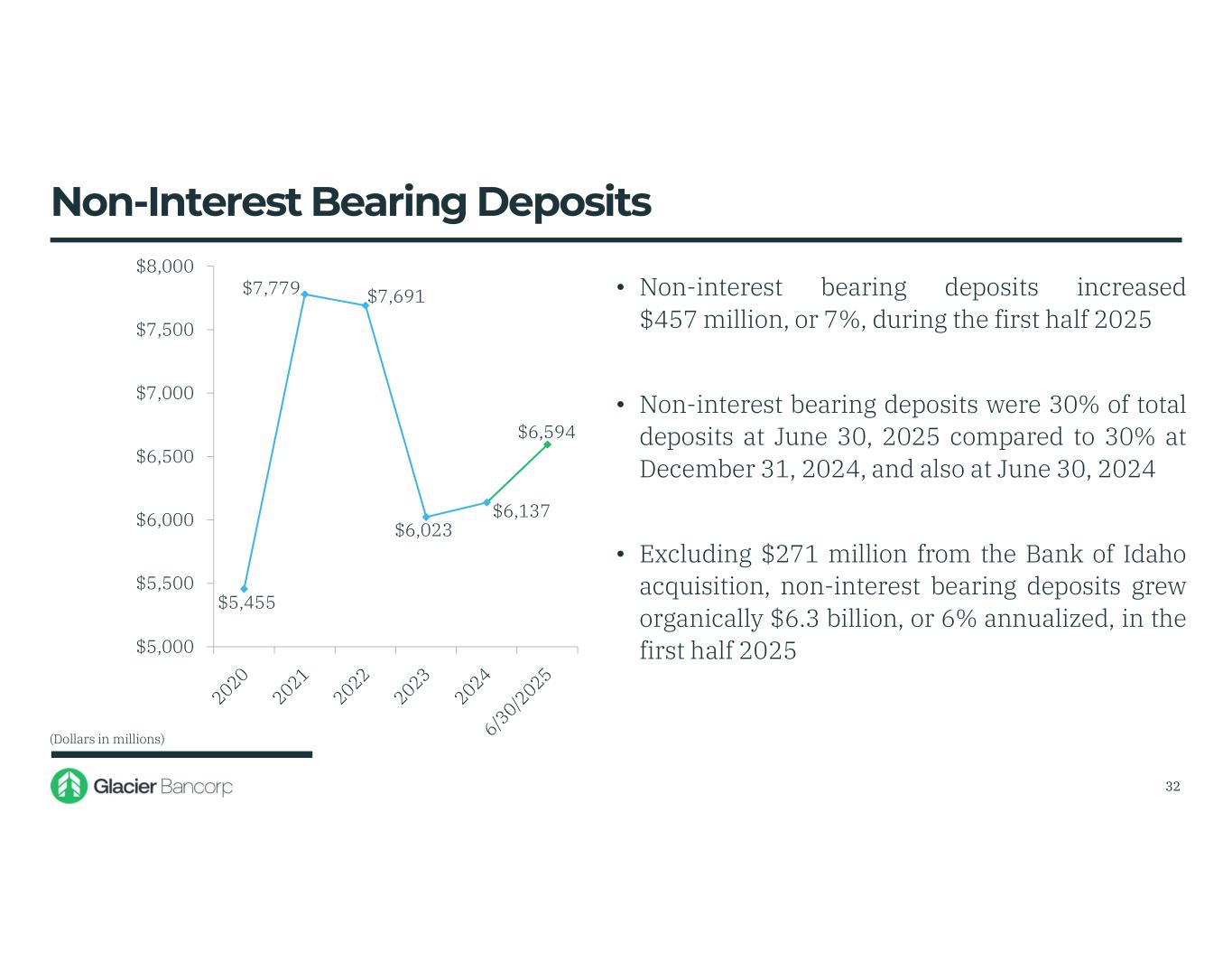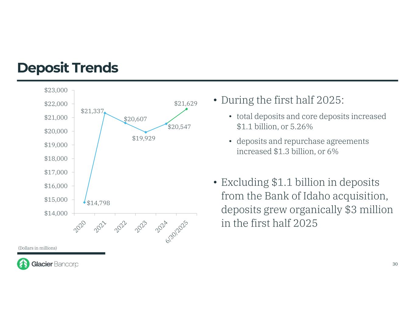 $14,798 $21,337 $20,607 $19,929 $20,547 $21,629 $14,000 $15,000 $16,000 $17,000 $18,000 $19,000 $20,000 $21,000 $22,000 $23,000 • During the first half 2025: • total deposits and core deposits increased $1.1 billion, or 5.26% • deposits and repurchase agreements increased $1.3 billion, or 6% • Excluding $1.1 billion in deposits from the Bank of Idaho acquisition, deposits grew organically $3 million in the first half 2025 Deposit Trends (Dollars in millions) 30