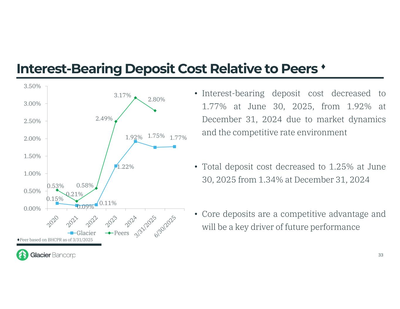 $5,455 $7,779 $7,691 $6,023 $6,137 $6,594 $5,000 $5,500 $6,000 $6,500 $7,000 $7,500 $8,000 • Non-interest bearing deposits increased $457 million, or 7%, during the first half 2025 • Non-interest bearing deposits were 30% of total deposits at June 30, 2025 compared to 30% at December 31, 2024, and also at June 30, 2024 • Excluding $271 million from the Bank of Idaho acquisition, non-interest bearing deposits grew organically $6.3 billion, or 6% annualized, in the first half 2025 Non-Interest Bearing Deposits (Dollars in millions) 32