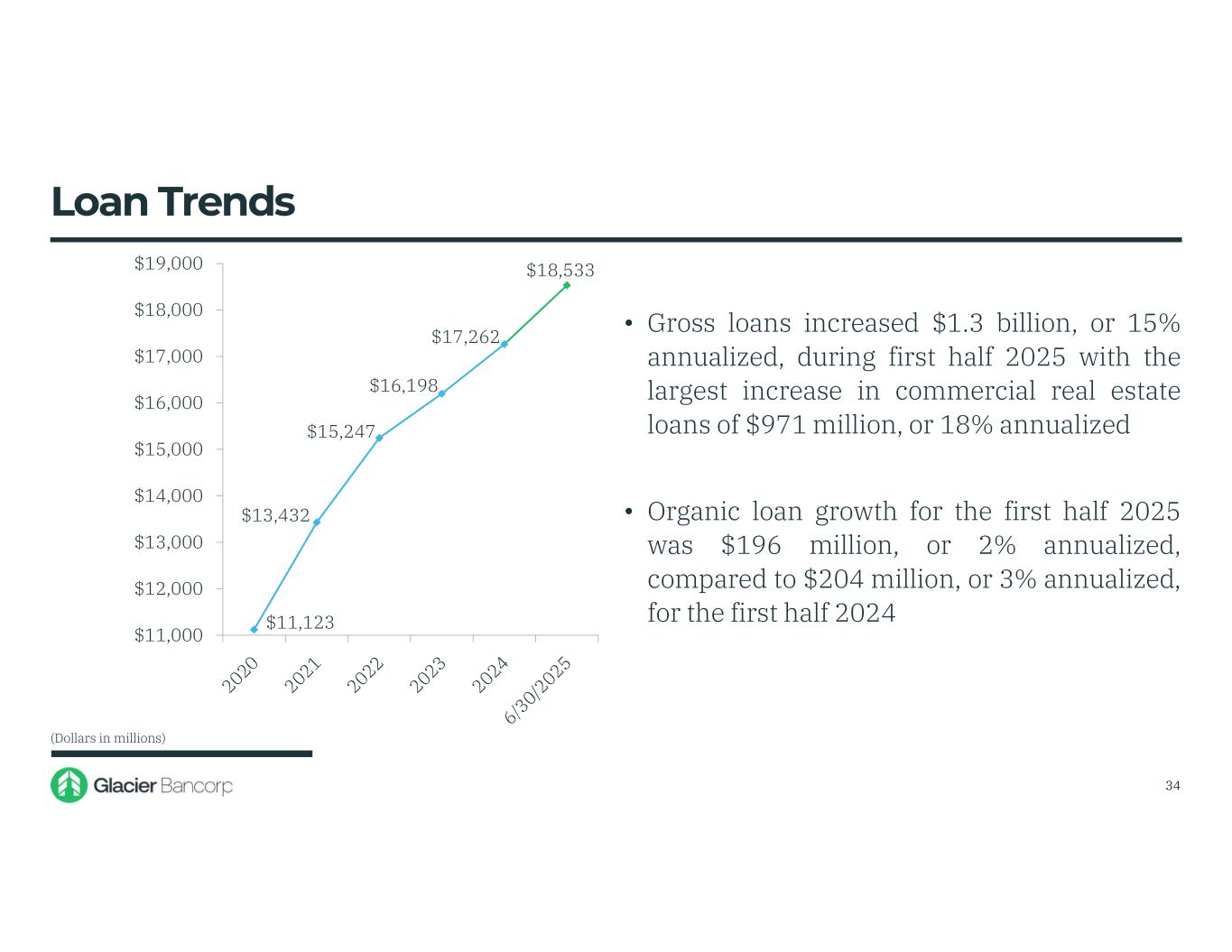 0.15% 0.09% 0.11% 1.22% 1.92% 1.75% 1.77% 0.53% 0.21% 0.58% 2.49% 3.17% 2.80% 0.00% 0.50% 1.00% 1.50% 2.00% 2.50% 3.00% 3.50% Glacier Peers • Interest-bearing deposit cost decreased to 1.77% at June 30, 2025, from 1.92% at December 31, 2024 due to market dynamics and the competitive rate environment • Total deposit cost decreased to 1.25% at June 30, 2025 from 1.34% at December 31, 2024 • Core deposits are a competitive advantage and will be a key driver of future performance Interest-Bearing Deposit Cost Relative to Peers ♦ ♦Peer based on BHCPR as of 3/31/2025 33