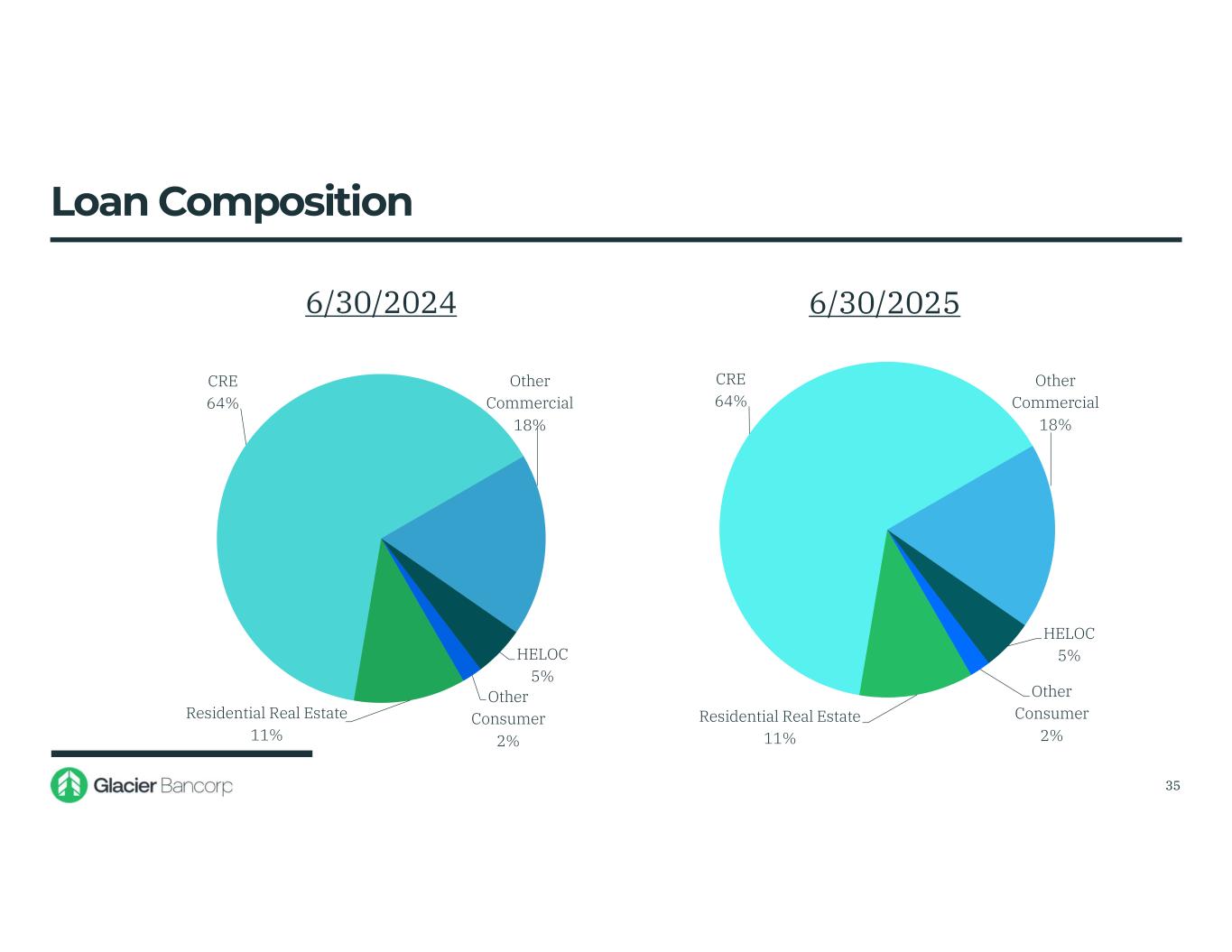 Residential Real Estate 11% CRE 64% Other Commercial 18% HELOC 5% Other Consumer 2% 6/30/2024 Residential Real Estate 11% CRE 64% Other Commercial 18% HELOC 5% Other Consumer 2% 6/30/2025 Loan Composition 35