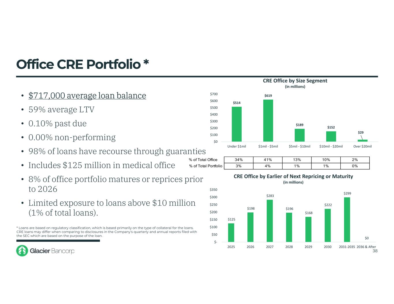 Term CRE Portfolio * Diversified and Low Risk Portfolio • Total portfolio $7.3 billion (42% of total portfolio) • Non-owner portfolio $4.0 billion (23% of total portfolio) • $907,000 average loan balance • 58% average LTV • 0.25% past due rate • 0.04% non-performing • 98% of loans have recourse through guaranties • Geographically dispersed across 8 states 37 45% 55% TOTAL CRE BY OCCUPANCY TYPE Owner Occupied Non-Owner Occupied UT 18% ID 11% MT 24%WY 6% NV 8% CO 11% WA 8% AZ 14% CRE GEOGRAPHIC DISPERSION * Loans are based on regulatory classification, which is based primarily on the type of collateral for the loans. CRE loans may differ when comparing to disclosures in the Company’s quarterly and annual reports filed with the SEC which are based on the purpose of the loan.
