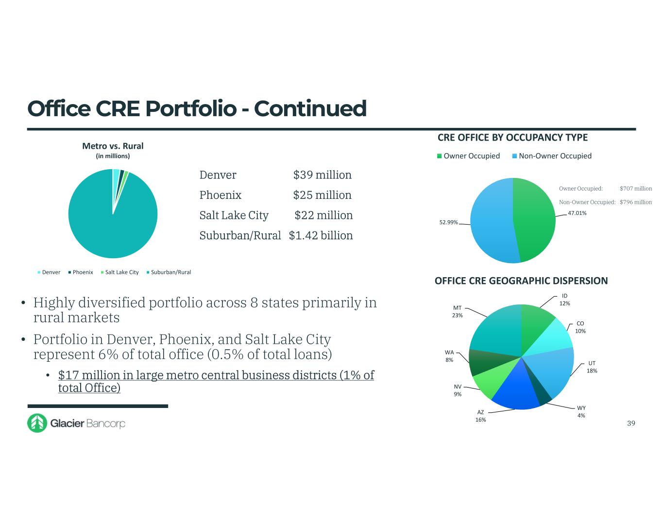 Office CRE Portfolio - Continued Denver $39 million Phoenix $25 million Salt Lake City $22 million Suburban/Rural $1.42 billion • Highly diversified portfolio across 8 states primarily in rural markets • Portfolio in Denver, Phoenix, and Salt Lake City represent 6% of total office (0.5% of total loans) • $17 million in large metro central business districts (1% of total Office) 39 Owner Occupied: $707 million Non-Owner Occupied: $796 million Metro vs. Rural (in millions) Denver Phoenix Salt Lake City Suburban/Rural 47.01% 52.99% CRE OFFICE BY OCCUPANCY TYPE Owner Occupied Non-Owner Occupied ID 12% CO 10% UT 18% WY 4%AZ 16% NV 9% WA 8% MT 23% OFFICE CRE GEOGRAPHIC DISPERSION