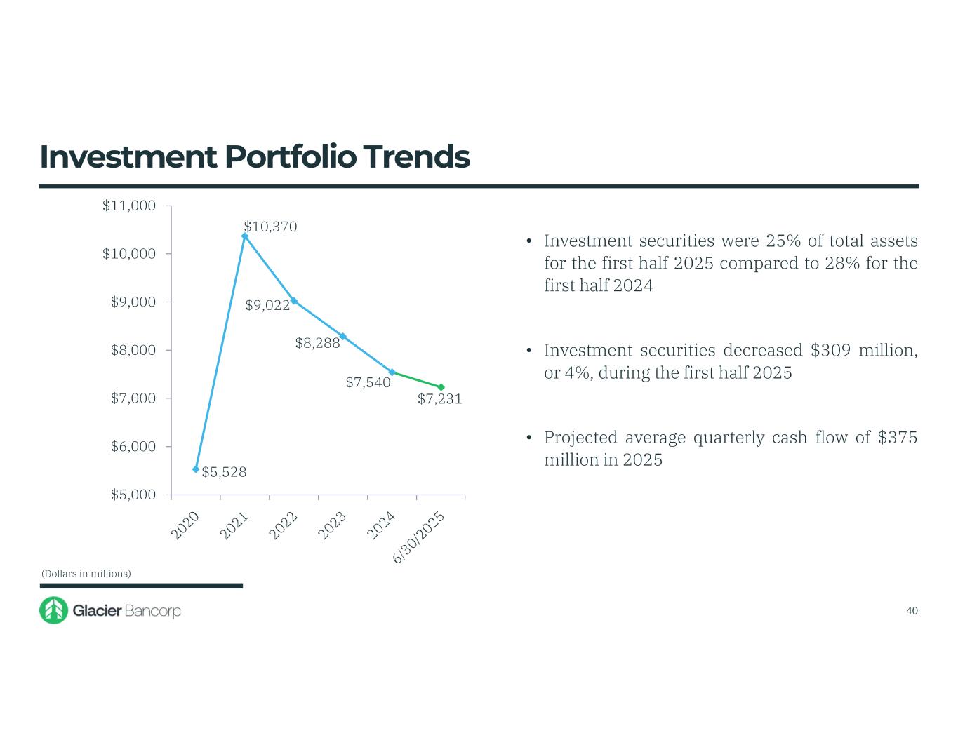 $5,528 $10,370 $9,022 $8,288 $7,540 $7,231 $5,000 $6,000 $7,000 $8,000 $9,000 $10,000 $11,000 • Investment securities were 25% of total assets for the first half 2025 compared to 28% for the first half 2024 • Investment securities decreased $309 million, or 4%, during the first half 2025 • Projected average quarterly cash flow of $375 million in 2025 Investment Portfolio Trends (Dollars in millions) 40