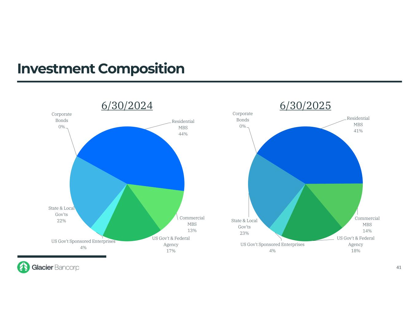 US Gov't & Federal Agency 17% US Gov't Sponsored Enterprises 4% State & Local Gov'ts 22% Corporate Bonds 0% Residential MBS 44% Commercial MBS 13% 6/30/2024 US Gov't & Federal Agency 18% US Gov't Sponsored Enterprises 4% State & Local Gov'ts 23% Corporate Bonds 0% Residential MBS 41% Commercial MBS 14% 6/30/2025 Investment Composition 41
