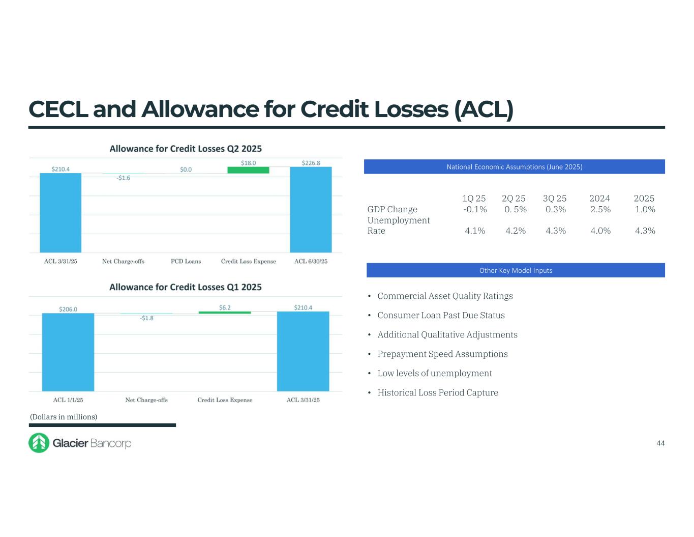 CECL and Allowance for Credit Losses (ACL) • Commercial Asset Quality Ratings • Consumer Loan Past Due Status • Additional Qualitative Adjustments • Prepayment Speed Assumptions • Low levels of unemployment • Historical Loss Period Capture (Dollars in millions) Other Key Model Inputs National Economic Assumptions (June 2025) 1Q 25 2Q 25 3Q 25 2024 2025 GDP Change -0.1% 0. 5% 0.3% 2.5% 1.0% Unemployment Rate 4.1% 4.2% 4.3% 4.0% 4.3% 1.19% of Total Loans 1.19% of Total Loans 44