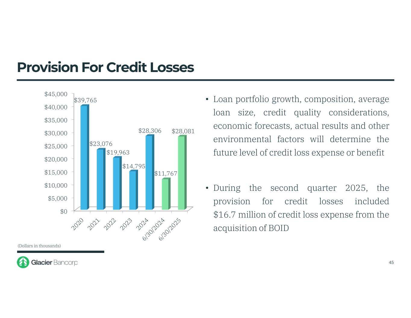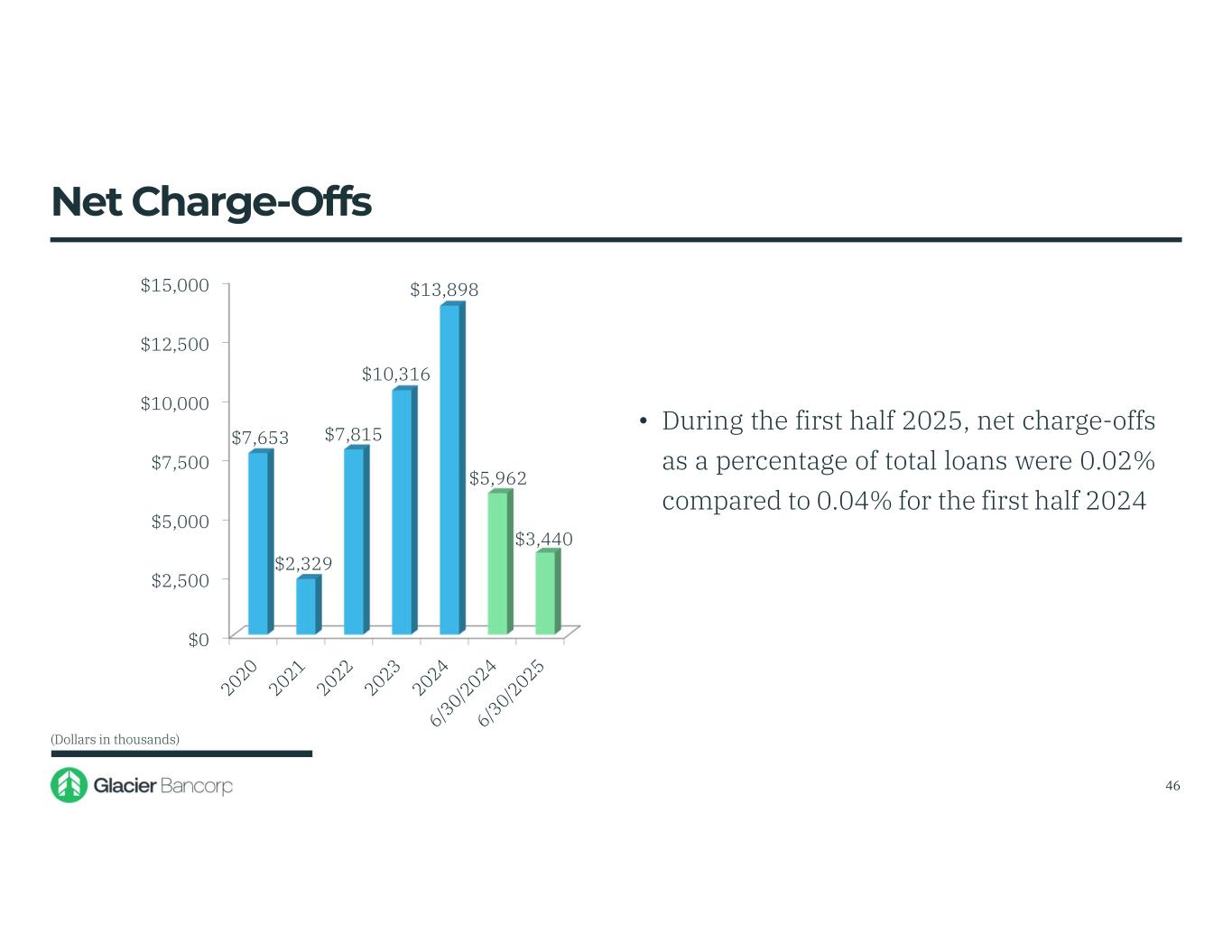 $0 $5,000 $10,000 $15,000 $20,000 $25,000 $30,000 $35,000 $40,000 $45,000 $39,765 $23,076 $19,963 $14,795 $28,306 $11,767 $28,081 • Loan portfolio growth, composition, average loan size, credit quality considerations, economic forecasts, actual results and other environmental factors will determine the future level of credit loss expense or benefit • During the second quarter 2025, the provision for credit losses included $16.7 million of credit loss expense from the acquisition of BOID Provision For Credit Losses (Dollars in thousands) 45