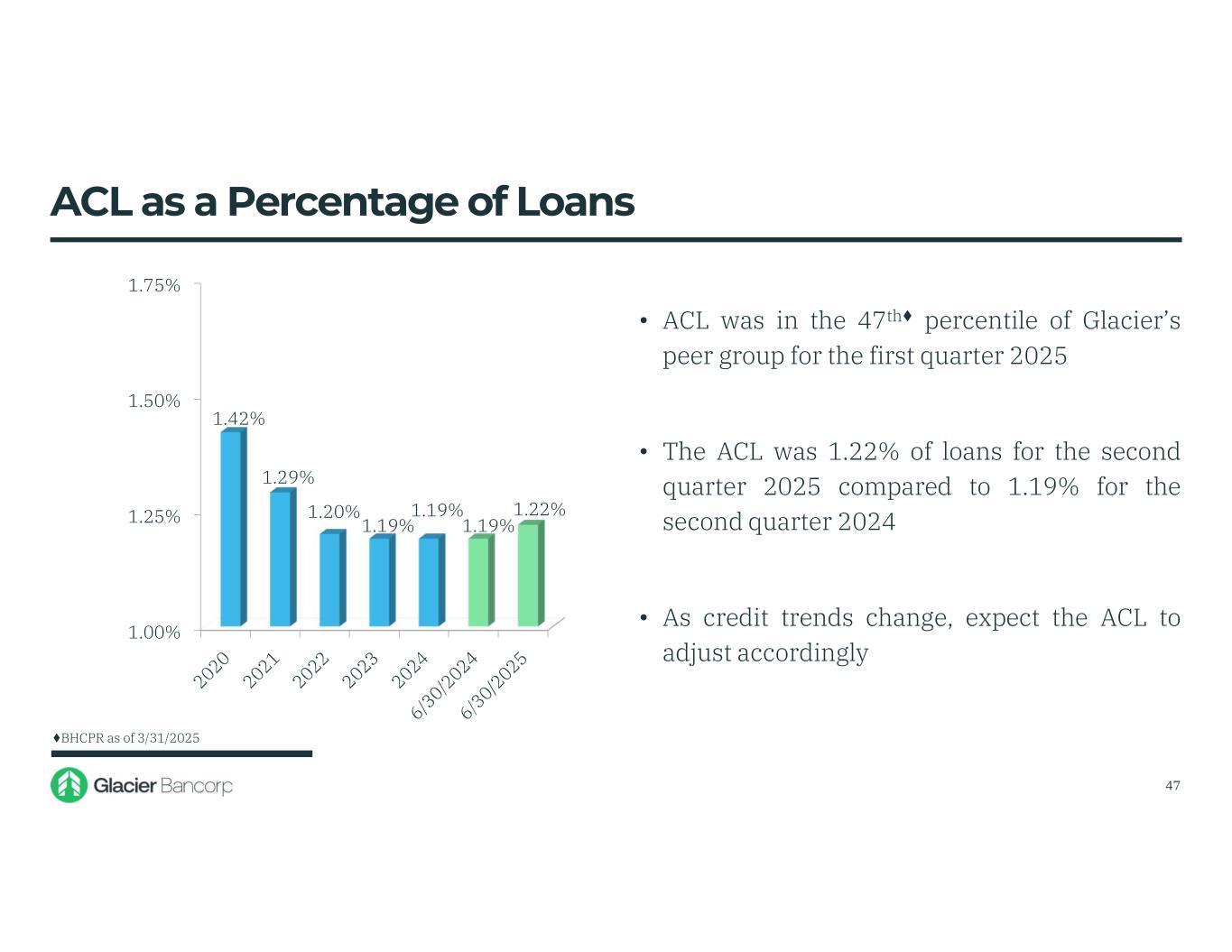 1.00% 1.25% 1.50% 1.75% 1.42% 1.29% 1.20% 1.19% 1.19% 1.19% 1.22% • ACL was in the 47th♦ percentile of Glacier’s peer group for the first quarter 2025 • The ACL was 1.22% of loans for the second quarter 2025 compared to 1.19% for the second quarter 2024 • As credit trends change, expect the ACL to adjust accordingly ACL as a Percentage of Loans ♦BHCPR as of 3/31/2025 47