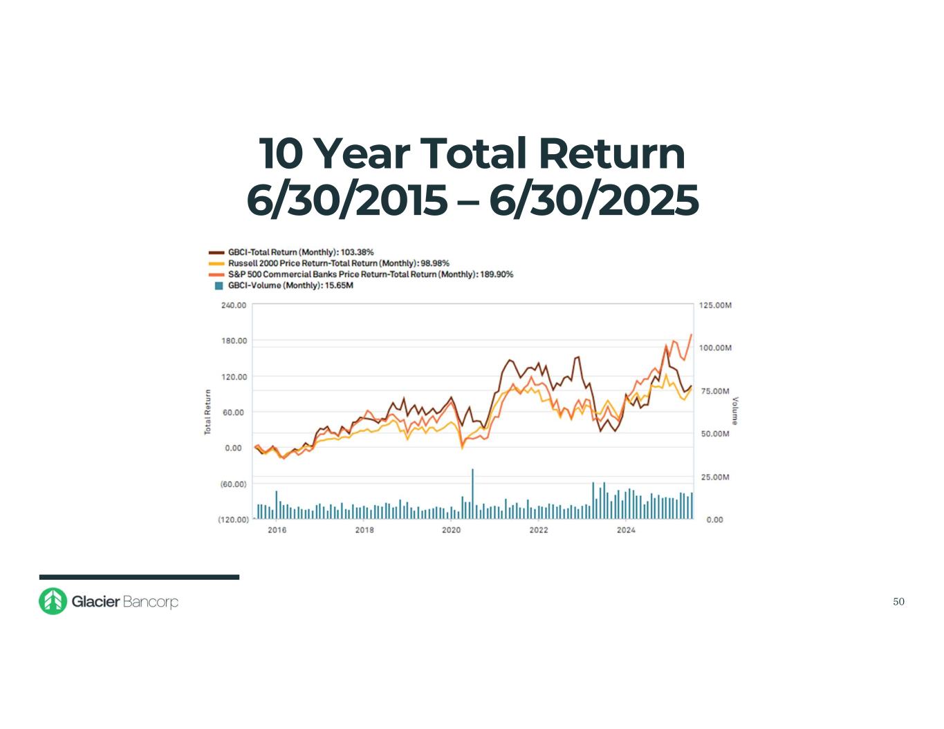 $0.50 $0.60 $0.70 $0.80 $0.90 $1.00 $1.10 $1.20 $1.30 • At June 30, 2025, Glacier’s dividend yield was 3.06% • The Company has declared 161 consecutive quarterly dividends Dividends Declared 49