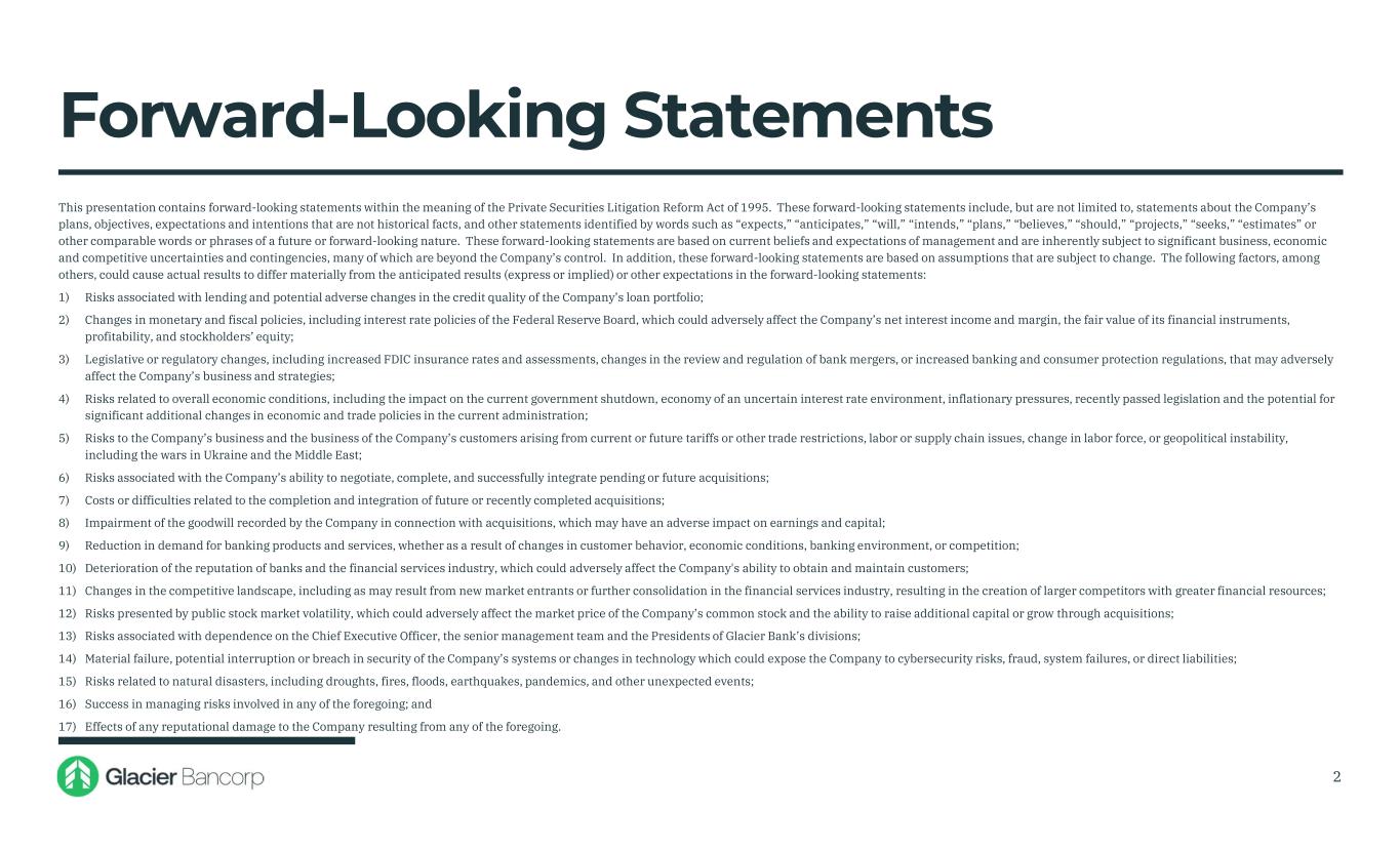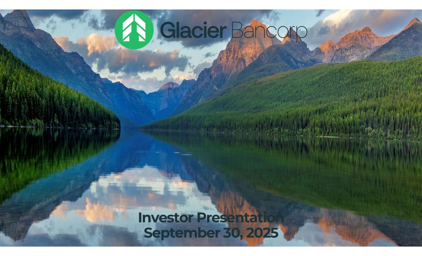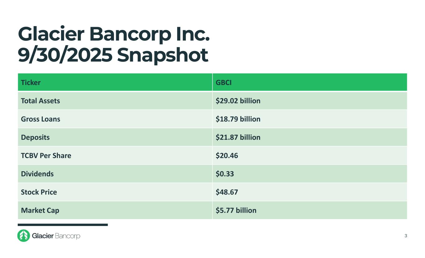 Forward-Looking Statements This presentation contains forward-looking statements within the meaning of the Private Securities Litigation Reform Act of 1995. These forward-looking statements include, but are not limited to, statements about the Company’s plans, objectives, expectations and intentions that are not historical facts, and other statements identified by words such as “expects,” “anticipates,” “will,” “intends,” “plans,” “believes,” “should,” “projects,” “seeks,” “estimates” or other comparable words or phrases of a future or forward-looking nature. These forward-looking statements are based on current beliefs and expectations of management and are inherently subject to significant business, economic and competitive uncertainties and contingencies, many of which are beyond the Company’s control. In addition, these forward-looking statements are based on assumptions that are subject to change. The following factors, among others, could cause actual results to differ materially from the anticipated results (express or implied) or other expectations in the forward-looking statements: 1) Risks associated with lending and potential adverse changes in the credit quality of the Company’s loan portfolio; 2) Changes in monetary and fiscal policies, including interest rate policies of the Federal Reserve Board, which could adversely affect the Company’s net interest income and margin, the fair value of its financial instruments, profitability, and stockholders’ equity; 3) Legislative or regulatory changes, including increased FDIC insurance rates and assessments, changes in the review and regulation of bank mergers, or increased banking and consumer protection regulations, that may adversely affect the Company’s business and strategies; 4) Risks related to overall economic conditions, including the impact on the current government shutdown, economy of an uncertain interest rate environment, inflationary pressures, recently passed legislation and the potential for significant additional changes in economic and trade policies in the current administration; 5) Risks to the Company’s business and the business of the Company’s customers arising from current or future tariffs or other trade restrictions, labor or supply chain issues, change in labor force, or geopolitical instability, including the wars in Ukraine and the Middle East; 6) Risks associated with the Company’s ability to negotiate, complete, and successfully integrate pending or future acquisitions; 7) Costs or difficulties related to the completion and integration of future or recently completed acquisitions; 8) Impairment of the goodwill recorded by the Company in connection with acquisitions, which may have an adverse impact on earnings and capital; 9) Reduction in demand for banking products and services, whether as a result of changes in customer behavior, economic conditions, banking environment, or competition; 10) Deterioration of the reputation of banks and the financial services industry, which could adversely affect the Company's ability to obtain and maintain customers; 11) Changes in the competitive landscape, including as may result from new market entrants or further consolidation in the financial services industry, resulting in the creation of larger competitors with greater financial resources; 12) Risks presented by public stock market volatility, which could adversely affect the market price of the Company’s common stock and the ability to raise additional capital or grow through acquisitions; 13) Risks associated with dependence on the Chief Executive Officer, the senior management team and the Presidents of Glacier Bank’s divisions; 14) Material failure, potential interruption or breach in security of the Company’s systems or changes in technology which could expose the Company to cybersecurity risks, fraud, system failures, or direct liabilities; 15) Risks related to natural disasters, including droughts, fires, floods, earthquakes, pandemics, and other unexpected events; 16) Success in managing risks involved in any of the foregoing; and 17) Effects of any reputational damage to the Company resulting from any of the foregoing. 2