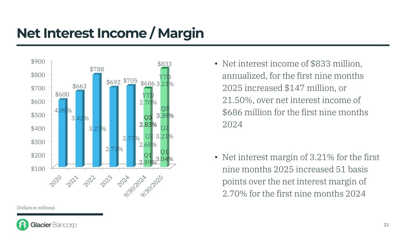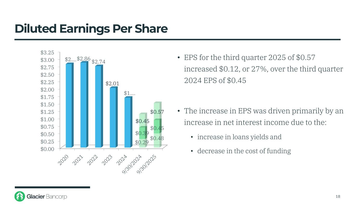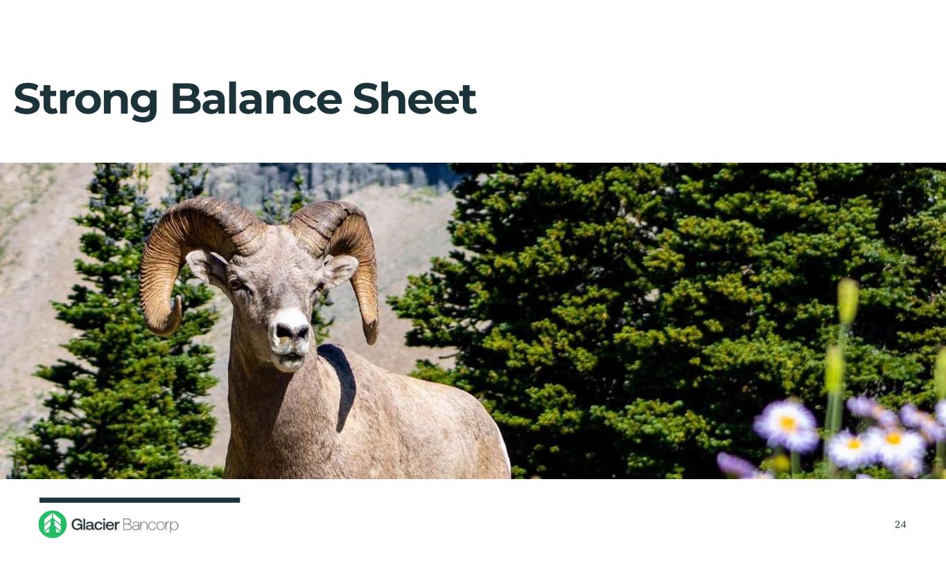 Forward-Looking Statements This presentation contains forward-looking statements within the meaning of the Private Securities Litigation Reform Act of 1995. These forward-looking statements include, but are not limited to, statements about the Company’s plans, objectives, expectations and intentions that are not historical facts, and other statements identified by words such as “expects,” “anticipates,” “will,” “intends,” “plans,” “believes,” “should,” “projects,” “seeks,” “estimates” or other comparable words or phrases of a future or forward-looking nature. These forward-looking statements are based on current beliefs and expectations of management and are inherently subject to significant business, economic and competitive uncertainties and contingencies, many of which are beyond the Company’s control. In addition, these forward-looking statements are based on assumptions that are subject to change. The following factors, among others, could cause actual results to differ materially from the anticipated results (express or implied) or other expectations in the forward-looking statements: 1) Risks associated with lending and potential adverse changes in the credit quality of the Company’s loan portfolio; 2) Changes in monetary and fiscal policies, including interest rate policies of the Federal Reserve Board, which could adversely affect the Company’s net interest income and margin, the fair value of its financial instruments, profitability, and stockholders’ equity; 3) Legislative or regulatory changes, including increased FDIC insurance rates and assessments, changes in the review and regulation of bank mergers, or increased banking and consumer protection regulations, that may adversely affect the Company’s business and strategies; 4) Risks related to overall economic conditions, including the impact on the current government shutdown, economy of an uncertain interest rate environment, inflationary pressures, recently passed legislation and the potential for significant additional changes in economic and trade policies in the current administration; 5) Risks to the Company’s business and the business of the Company’s customers arising from current or future tariffs or other trade restrictions, labor or supply chain issues, change in labor force, or geopolitical instability, including the wars in Ukraine and the Middle East; 6) Risks associated with the Company’s ability to negotiate, complete, and successfully integrate pending or future acquisitions; 7) Costs or difficulties related to the completion and integration of future or recently completed acquisitions; 8) Impairment of the goodwill recorded by the Company in connection with acquisitions, which may have an adverse impact on earnings and capital; 9) Reduction in demand for banking products and services, whether as a result of changes in customer behavior, economic conditions, banking environment, or competition; 10) Deterioration of the reputation of banks and the financial services industry, which could adversely affect the Company's ability to obtain and maintain customers; 11) Changes in the competitive landscape, including as may result from new market entrants or further consolidation in the financial services industry, resulting in the creation of larger competitors with greater financial resources; 12) Risks presented by public stock market volatility, which could adversely affect the market price of the Company’s common stock and the ability to raise additional capital or grow through acquisitions; 13) Risks associated with dependence on the Chief Executive Officer, the senior management team and the Presidents of Glacier Bank’s divisions; 14) Material failure, potential interruption or breach in security of the Company’s systems or changes in technology which could expose the Company to cybersecurity risks, fraud, system failures, or direct liabilities; 15) Risks related to natural disasters, including droughts, fires, floods, earthquakes, pandemics, and other unexpected events; 16) Success in managing risks involved in any of the foregoing; and 17) Effects of any reputational damage to the Company resulting from any of the foregoing. 2
