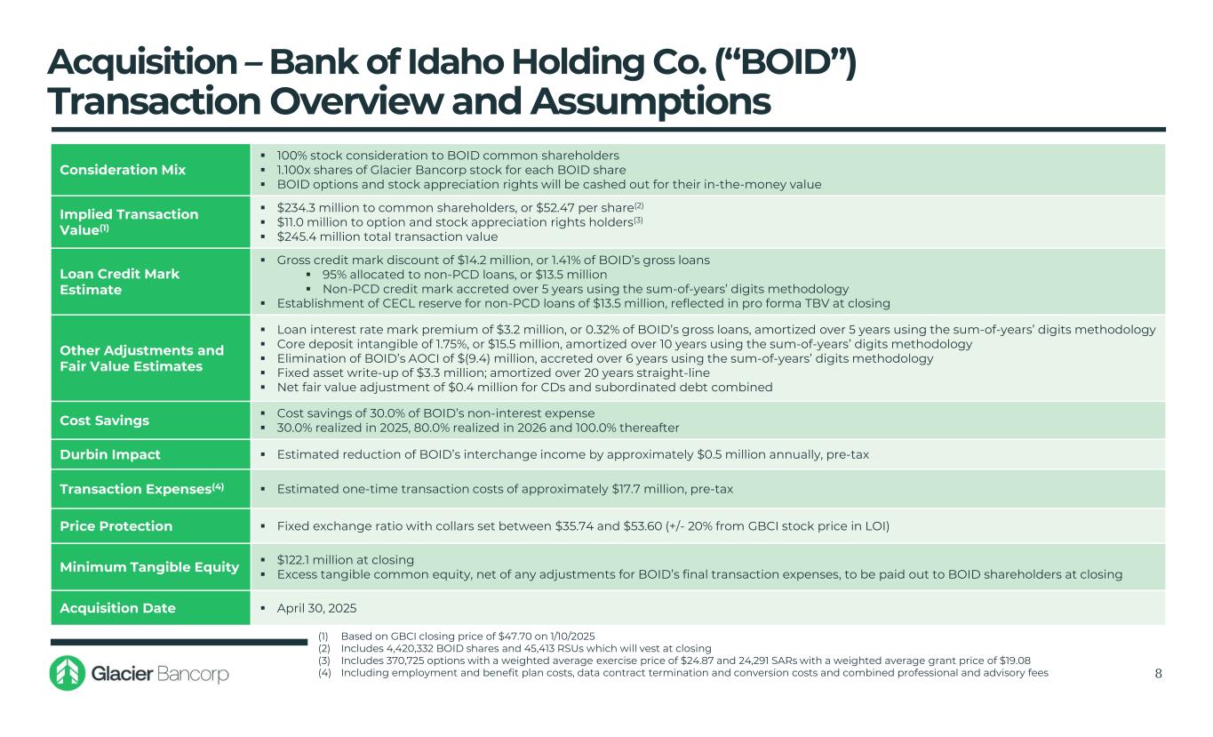 Acquisition – Bank of Idaho Holding Co. • Acquisition complements Glacier’s existing strong loan and deposit portfolios and deepens its presence in several of the top growth markets in the United States • Aligns with Glacier’s long-term strategy of acquiring quality banks in strong markets with exceptional teams • Further strengthens a market-leading franchise across Idaho and Eastern Washington • Positions Glacier as the 3rd largest bank and largest community bank in the state of Idaho, based on deposit market share • Transaction positions Glacier as the 5th largest community bank in Eastern Washington • Synergistic expansion of Glacier’s existing footprint in Eastern Idaho, Boise Metro and Eastern Washington • Bank of Idaho will merge into three existing Glacier divisions following the core system conversion in early September: Wheatland Bank, Mountain West Bank, and Citizens Community Bank 7