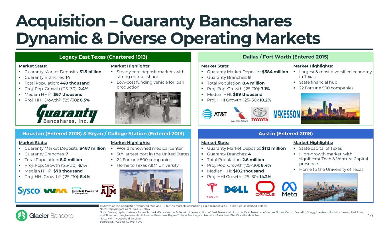 Acquisition - Guaranty Bancshares Overview 9 Consolidated Financial Highlights (Q2-2025) Company Overview  Bank founded in 1913 and headquartered in Mount Pleasant, Texas  Full-service community bank providing comprehensive financial services to businesses and individuals with 33 branch locations throughout East Texas, Dallas/Fort Worth, Houston, Austin and Bryan/College Station  Guaranty has grown from its East Texas roots into high-growth markets through organic expansion, augmented with strategic acquisitions ‒ Top 5 Texas bank deposit market share ranking in 8 of 13 markets(1,2)  Conservative credit culture resulting in pristine long-term asset quality 1) FDIC deposit data as of June 30, 2024 2) East Texas markets defined by counties of operation; Metro expansion markets defined by MSAs of operation 3) Excludes restructured loans Source: S&P Capital IQ Pro and SEC.gov Dallas / Fort Worth Market Austin Market Houston & Bryan / College Station Market East Texas Market 33 Branches Total Assets ($M) 3,144$ Net Income ($M) 18.6$ Gross Loans HFI ($M) 2,140$ ROAA 1.28% Deposits ($M) 2,709$ Net Interest Margin 3.71% Loans / Deposits 79.01% Efficiency Ratio 62.3% NIB Deposits / Deposits 31.58% Yield on Loans 6.38% TCE Ratio 10.56% Cost of Deposits 1.90% CETI Ratio 14.30% Total RBC Ratio 17.39% NPAs / Total Assets (3) 0.33% Reserves / Loans 1.29% NCOs / Avg. Loans 0.02% Balance Sheet Income Statement