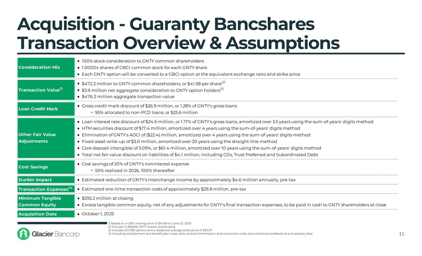 Acquisition – Guaranty Bancshares Dynamic & Diverse Operating Markets 10 Legacy East Texas (Chartered 1913) Market Stats:  Guaranty Market Deposits: $1.5 billion  Guaranty Branches: 14  Total Population: 449 thousand  Proj. Pop. Growth (‘25-’30): 2.4%  Median HHI(1): $67 thousand  Proj. HHI Growth(1) (‘25-’30): 8.5% Dallas / Fort Worth (Entered 2015) Houston (Entered 2018) & Bryan / College Station (Entered 2013) Austin (Entered 2018) Market Highlights:  Steady core deposit markets with strong market share  Low-cost funding vehicle for loan production Market Stats:  Guaranty Market Deposits: $584 million  Guaranty Branches: 8  Total Population: 8.4 million  Proj. Pop. Growth (‘25-’30): 7.1%  Median HHI: $89 thousand  Proj. HHI Growth (‘25-’30): 10.2% Market Highlights:  Largest & most diversified economy in Texas  State financial hub  22 Fortune 500 companies Market Stats:  Guaranty Market Deposits: $467 million  Guaranty Branches: 7  Total Population: 8.0 million  Proj. Pop. Growth (‘25-’30): 6.1%  Median HHI(1): $78 thousand  Proj. HHI Growth(1) (‘25-’30): 8.4% Market Highlights:  World renowned medical center  5th largest port in the United States  24 Fortune 500 companies  Home to Texas A&M University Market Stats:  Guaranty Market Deposits: $112 million  Guaranty Branches: 4  Total Population: 2.6 million  Proj. Pop. Growth (‘25-’30): 8.4%  Median HHI: $102 thousand  Proj. HHI Growth (‘25-’30): 14.2% Market Highlights:  State capital of Texas  High-growth market, with significant Tech & Venture Capital presence  Home to the University of Texas 1) Shown as the population-weighted Median HHI for the markets comprising each respective GNTY market (as defined below) Note: Deposit data as of June 30, 2024 Note: Demographic data are for each market’s respective MSA with the exception of East Texas and Houston; East Texas is defined as Bowie, Camp, Franklin, Gregg, Harrison, Hopkins, Lamar, Red River, and Titus counties; Houston is defined as Brenham, Bryan-College Station, and Houston-Pasadena-The Woodlands MSAs Note: HHI = Household Income Source: S&P Capital IQ Pro, FDIC