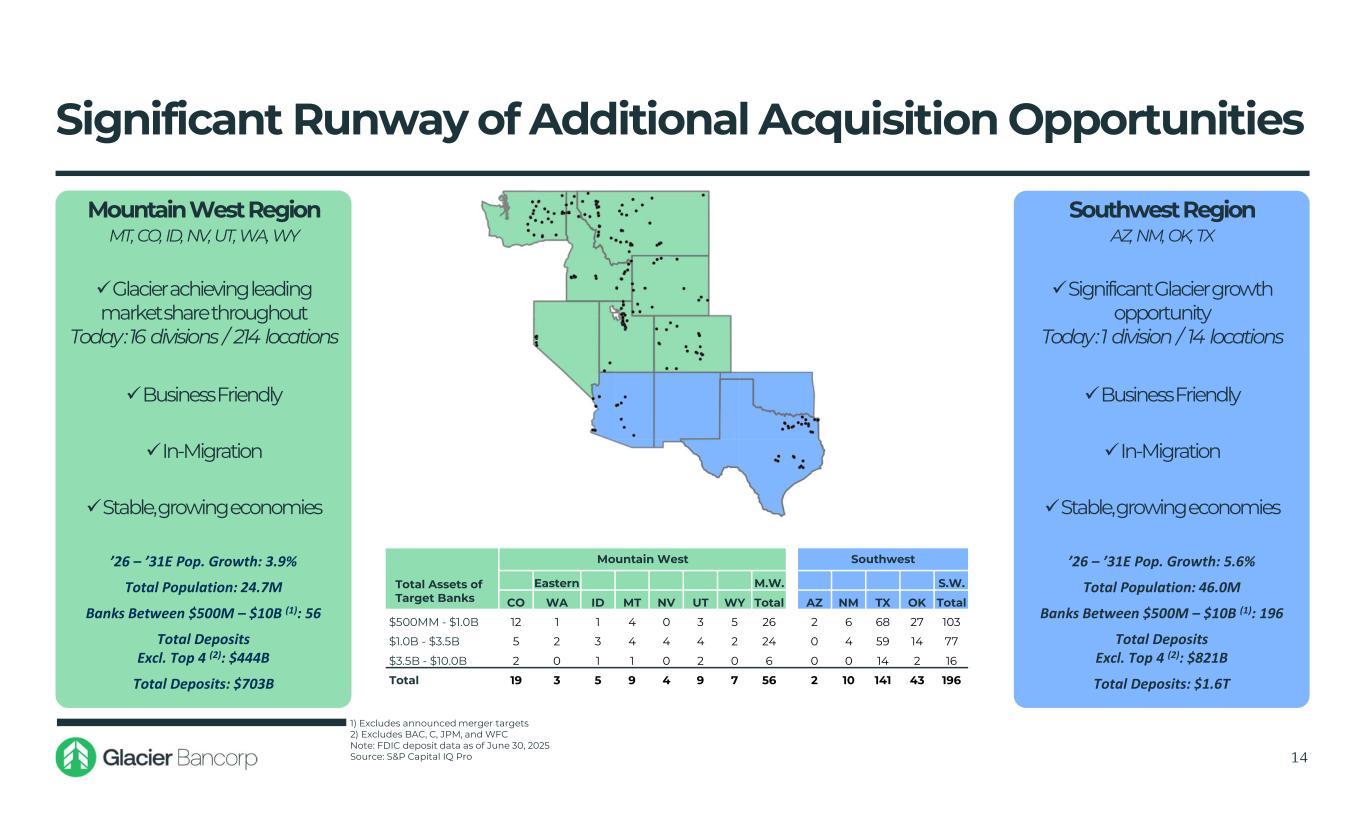 20252015 MarketGlacierMarketGlacier ShareDepositsRankTransactions since 2015ShareDepositsRankdollars in millions 25.8%$7,973121.0%$3,4332Montana 18.8%$3,205113.4%$1,0211Idaho 13.7%$2,84412.4%$19312Utah(1) 0.7%$2,71930------Texas 9.5%$1,8232------Arizona 3.4%$1,74071.8%$4929Colorado 9.7%$1,50844.2%$4517Eastern Washington(2) 8.1%$1,38429.2%$1,0002Wyoming 17.1%$1,0561------Nevada Track Record of Increasing Market Share Source: S&P Global Market Intelligence. Deposit market share is as of June 30, 2015 and June 30, 2025 Deposit market share is for banks with less than $50 billion in assets 1) Excludes Sofi, LC, and GDOT 2) Eastern Washington defined as counties located east of the Cascade Range. Includes Adams, Asotin, Benton, Chelan, Columbia, Douglas, Ferry, Franklin, Garfield, Grant, Kittitas, Klickitat, Lincoln, Okanogan, Pend Oreille, Spokane, Stevens, Walla Walla, Whitman, and Yakima counties 13