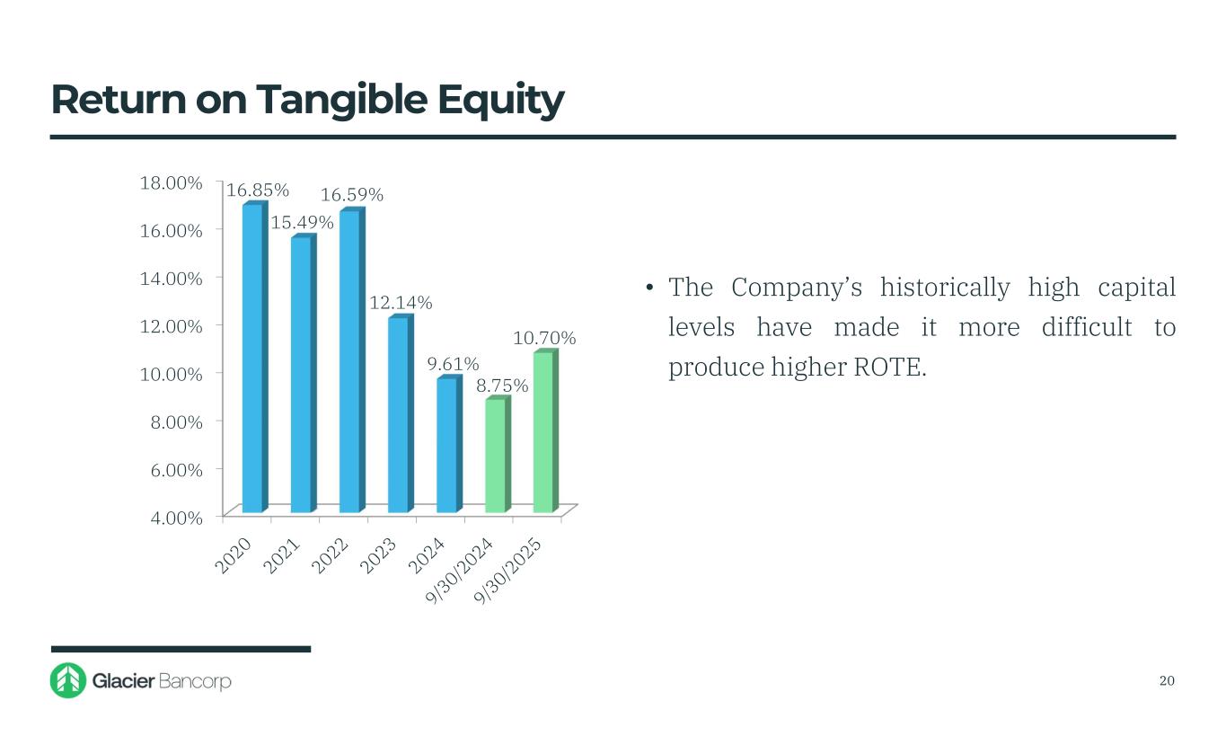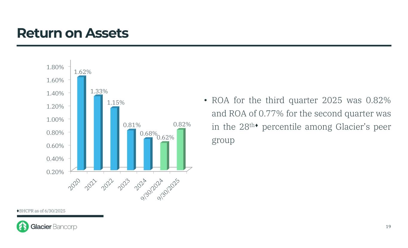 0.20% 0.40% 0.60% 0.80% 1.00% 1.20% 1.40% 1.60% 1.80% 1.62% 0.68% 1.33% 0.81% 0.62% 0.82% • ROA for the third quarter 2025 was 0.82% and ROA of 0.77% for the second quarter was in the 28th percentile among Glacier’s peer group Return on Assets BHCPR as of 6/30/2025 1.15% 19