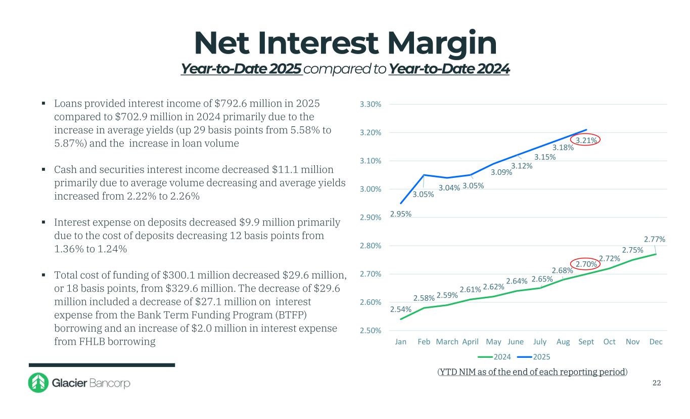$100 $200 $300 $400 $500 $600 $700 $800 $900 $600 $663 $788 $692 $705 $686 $833 4.09% 3.42% 3.27% 2.73% 2.77% Q2 2.68% Q2 3.21% Q1 2.59% Q1 3.04% Q3 2.83% • Net interest income of $833 million, annualized, for the first nine months 2025 increased $147 million, or 21.50%, over net interest income of $686 million for the first nine months 2024 • Net interest margin of 3.21% for the first nine months 2025 increased 51 basis points over the net interest margin of 2.70% for the first nine months 2024 Net Interest Income / Margin (Dollars in millions) 21 YTD 3.21% YTD 2.70% Q3 3.39%