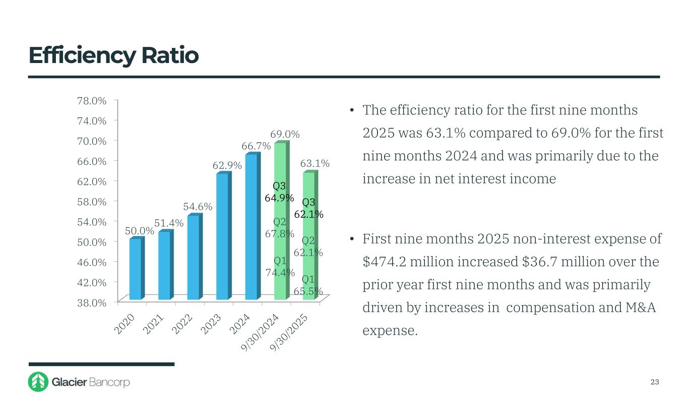 Net Interest Margin Year-to-Date 2025 compared to Year-to-Date 2024 2.54% 2.58% 2.59% 2.61% 2.62% 2.64% 2.65% 2.68% 2.70% 2.72% 2.75% 2.77% 2.95% 3.05% 3.04% 3.05% 3.09% 3.12% 3.15% 3.18% 3.21% 2.50% 2.60% 2.70% 2.80% 2.90% 3.00% 3.10% 3.20% 3.30% Jan Feb March April May June July Aug Sept Oct Nov Dec 2024 2025 (YTD NIM as of the end of each reporting period)  Loans provided interest income of $792.6 million in 2025 compared to $702.9 million in 2024 primarily due to the increase in average yields (up 29 basis points from 5.58% to 5.87%) and the increase in loan volume  Cash and securities interest income decreased $11.1 million primarily due to average volume decreasing and average yields increased from 2.22% to 2.26%  Interest expense on deposits decreased $9.9 million primarily due to the cost of deposits decreasing 12 basis points from 1.36% to 1.24%  Total cost of funding of $300.1 million decreased $29.6 million, or 18 basis points, from $329.6 million. The decrease of $29.6 million included a decrease of $27.1 million on interest expense from the Bank Term Funding Program (BTFP) borrowing and an increase of $2.0 million in interest expense from FHLB borrowing 22