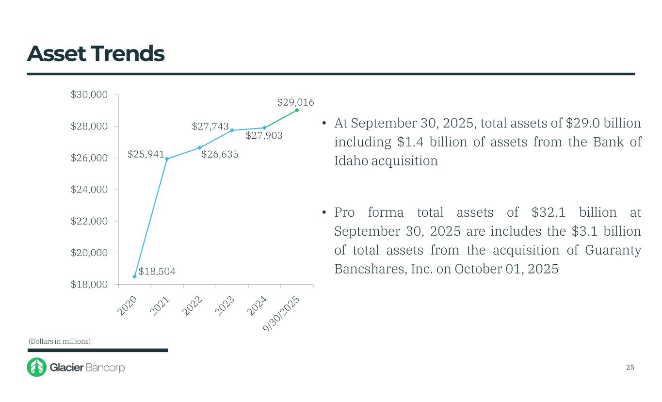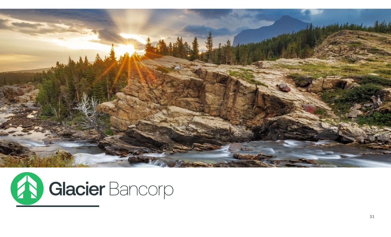 Glacier Bancorp Inc. 9/30/2025 Snapshot GBCITicker $29.02 billionTotal Assets $18.79 billionGross Loans $21.87 billionDeposits $20.46TCBV Per Share $0.33Dividends $48.67Stock Price $5.77 billionMarket Cap 3