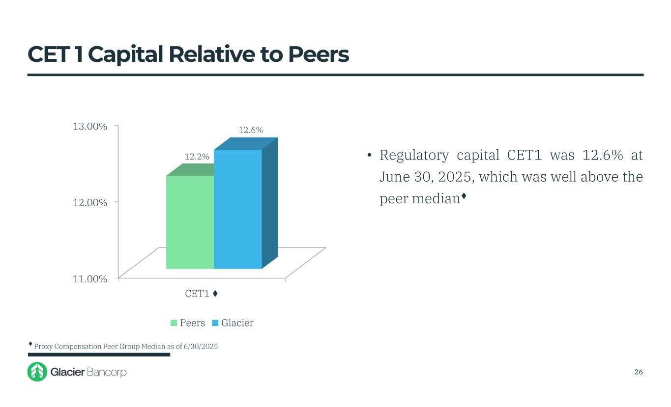 $18,504 $25,941 $26,635 $27,743 $27,903 $29,016 $18,000 $20,000 $22,000 $24,000 $26,000 $28,000 $30,000 • At September 30, 2025, total assets of $29.0 billion including $1.4 billion of assets from the Bank of Idaho acquisition • Pro forma total assets of $32.1 billion at September 30, 2025 are includes the $3.1 billion of total assets from the acquisition of Guaranty Bancshares, Inc. on October 01, 2025 Asset Trends (Dollars in millions) 25