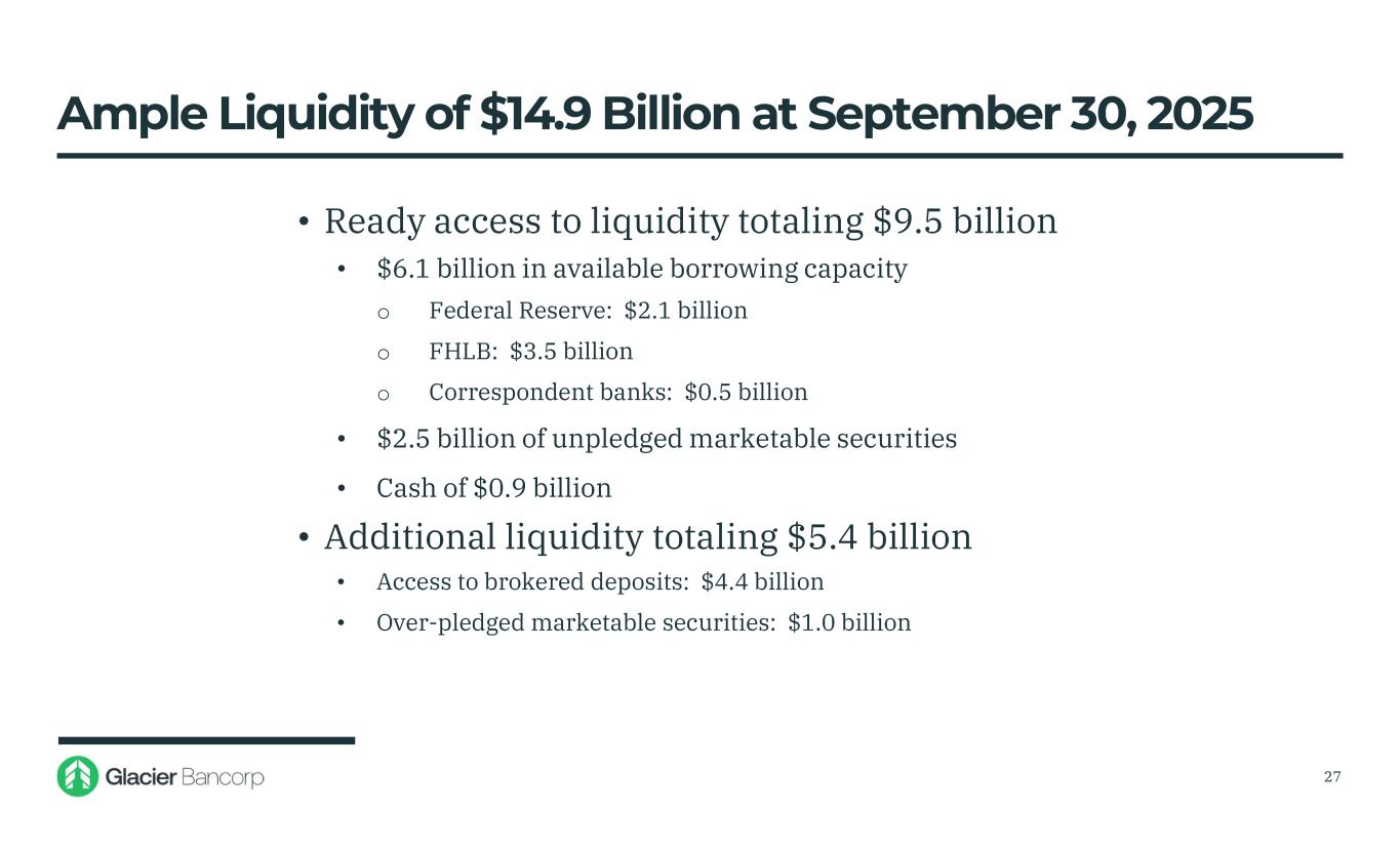 11.00% 12.00% 13.00% CET1 12.2% 12.6% Peers Glacier • Regulatory capital CET1 was 12.6% at June 30, 2025, which was well above the peer median CET 1 Capital Relative to Peers Proxy Compensation Peer Group Median as of 6/30/2025 26