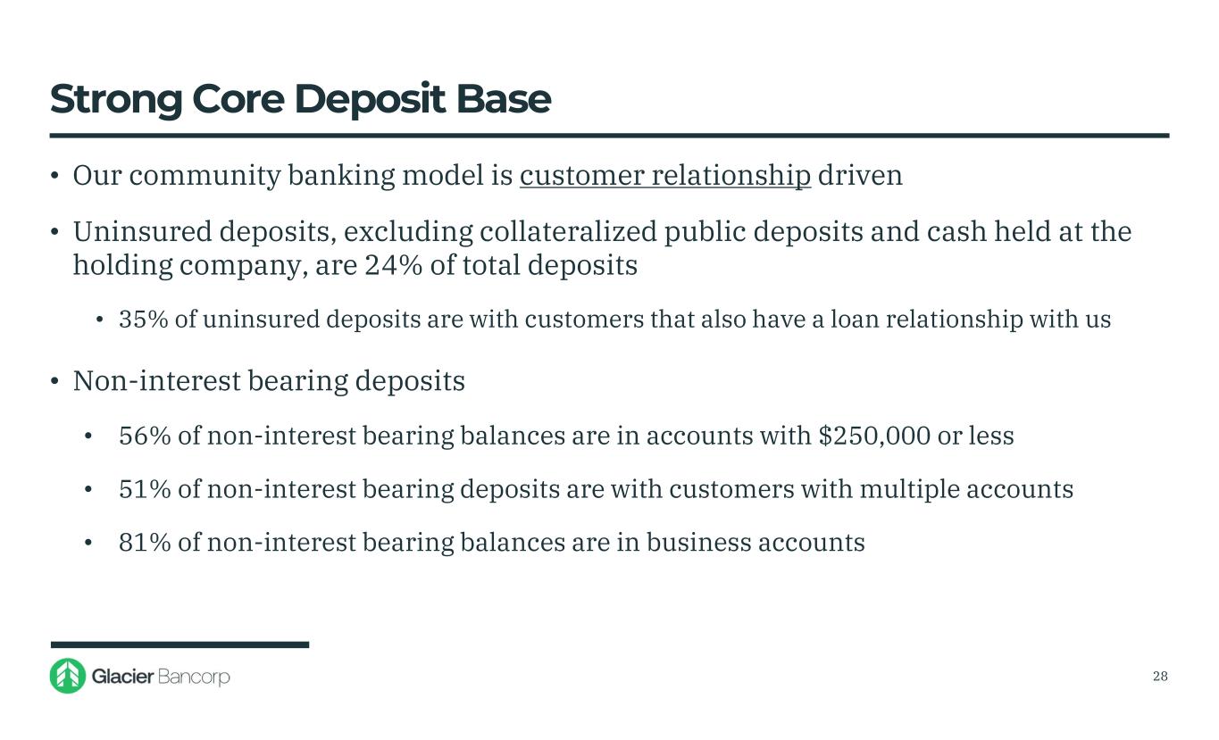 Ample Liquidity of $14.9 Billion at September 30, 2025 • Ready access to liquidity totaling $9.5 billion • $6.1 billion in available borrowing capacity o Federal Reserve: $2.1 billion o FHLB: $3.5 billion o Correspondent banks: $0.5 billion • $2.5 billion of unpledged marketable securities • Cash of $0.9 billion • Additional liquidity totaling $5.4 billion • Access to brokered deposits: $4.4 billion • Over-pledged marketable securities: $1.0 billion 27