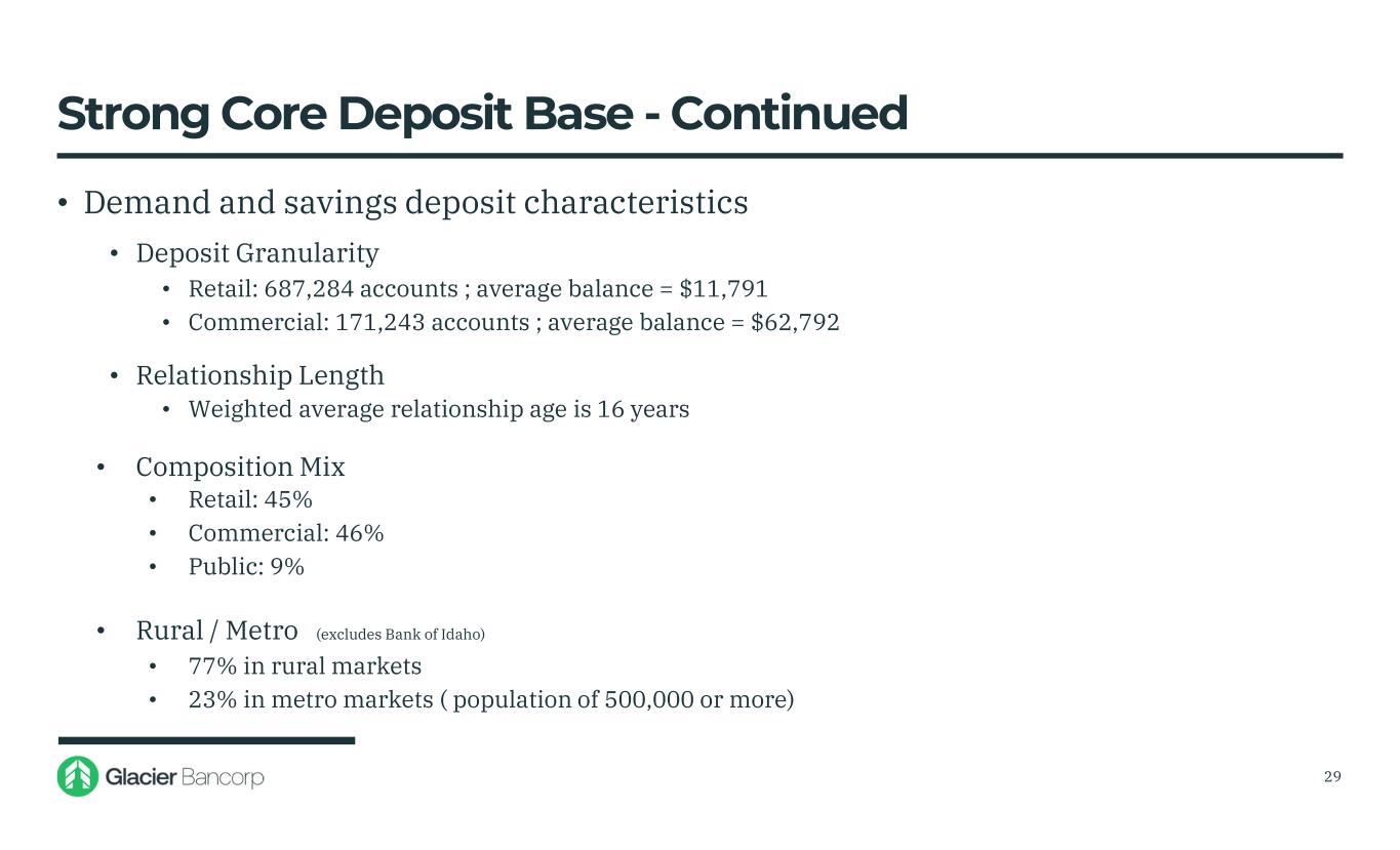 Strong Core Deposit Base • Our community banking model is customer relationship driven • Uninsured deposits, excluding collateralized public deposits and cash held at the holding company, are 24% of total deposits • 35% of uninsured deposits are with customers that also have a loan relationship with us • Non-interest bearing deposits • 56% of non-interest bearing balances are in accounts with $250,000 or less • 51% of non-interest bearing deposits are with customers with multiple accounts • 81% of non-interest bearing balances are in business accounts 28