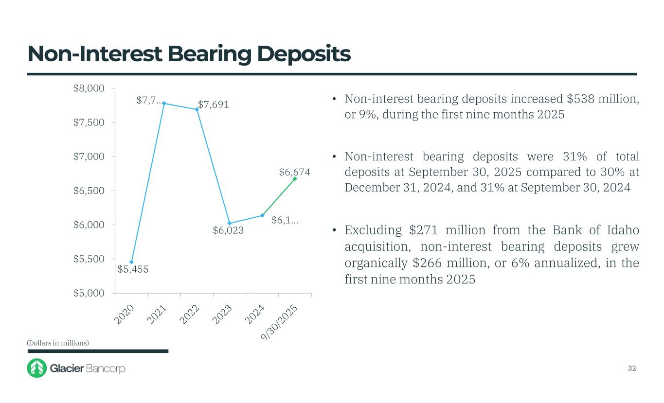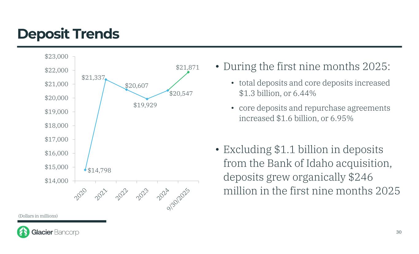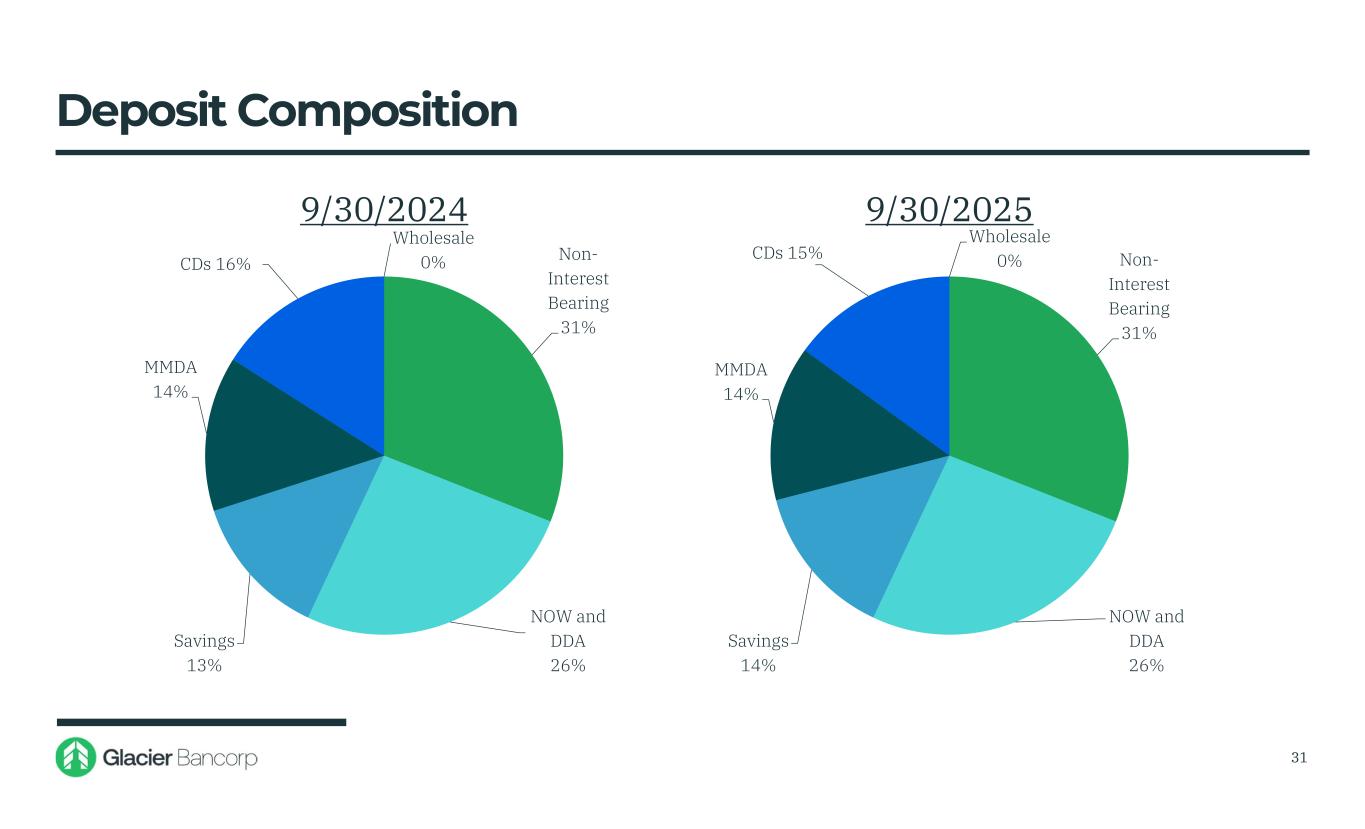 $14,798 $21,337 $20,607 $19,929 $20,547 $21,871 $14,000 $15,000 $16,000 $17,000 $18,000 $19,000 $20,000 $21,000 $22,000 $23,000 • During the first nine months 2025: • total deposits and core deposits increased $1.3 billion, or 6.44% • core deposits and repurchase agreements increased $1.6 billion, or 6.95% • Excluding $1.1 billion in deposits from the Bank of Idaho acquisition, deposits grew organically $246 million in the first nine months 2025 Deposit Trends (Dollars in millions) 30