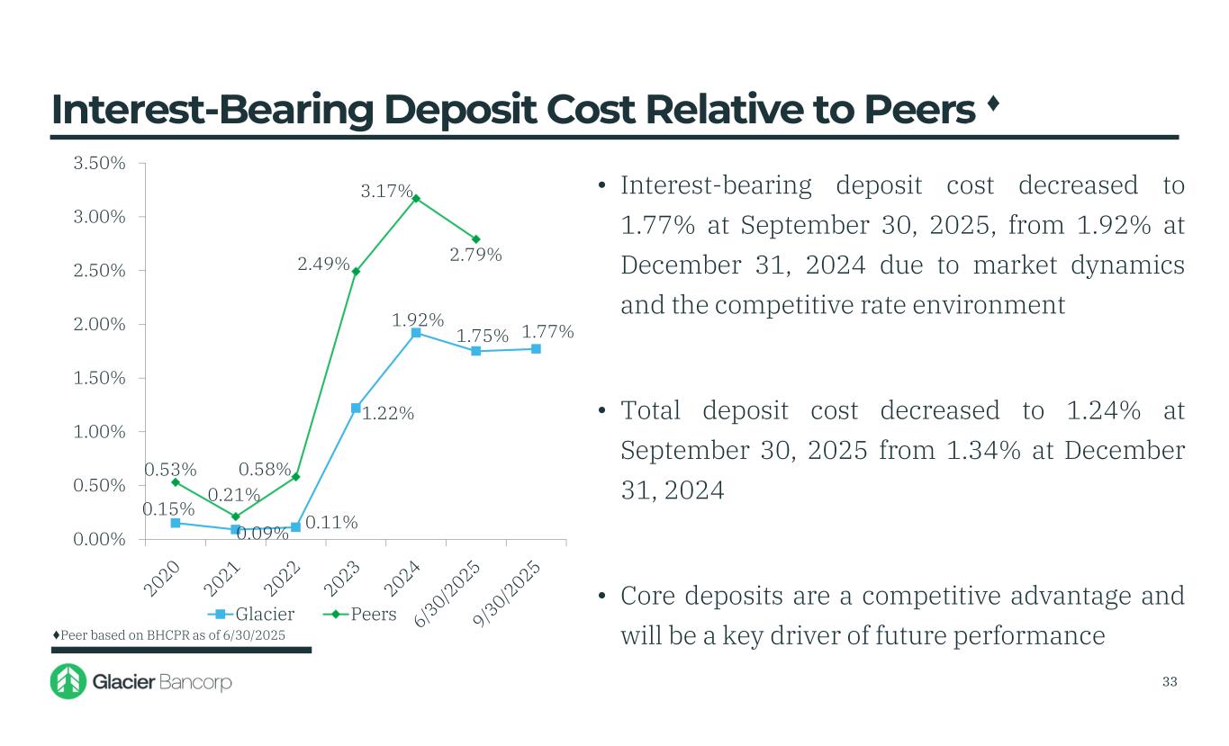 $5,455 $7,7… $7,691 $6,023 $6,1… $6,674 $5,000 $5,500 $6,000 $6,500 $7,000 $7,500 $8,000 • Non-interest bearing deposits increased $538 million, or 9%, during the first nine months 2025 • Non-interest bearing deposits were 31% of total deposits at September 30, 2025 compared to 30% at December 31, 2024, and 31% at September 30, 2024 • Excluding $271 million from the Bank of Idaho acquisition, non-interest bearing deposits grew organically $266 million, or 6% annualized, in the first nine months 2025 Non-Interest Bearing Deposits (Dollars in millions) 32
