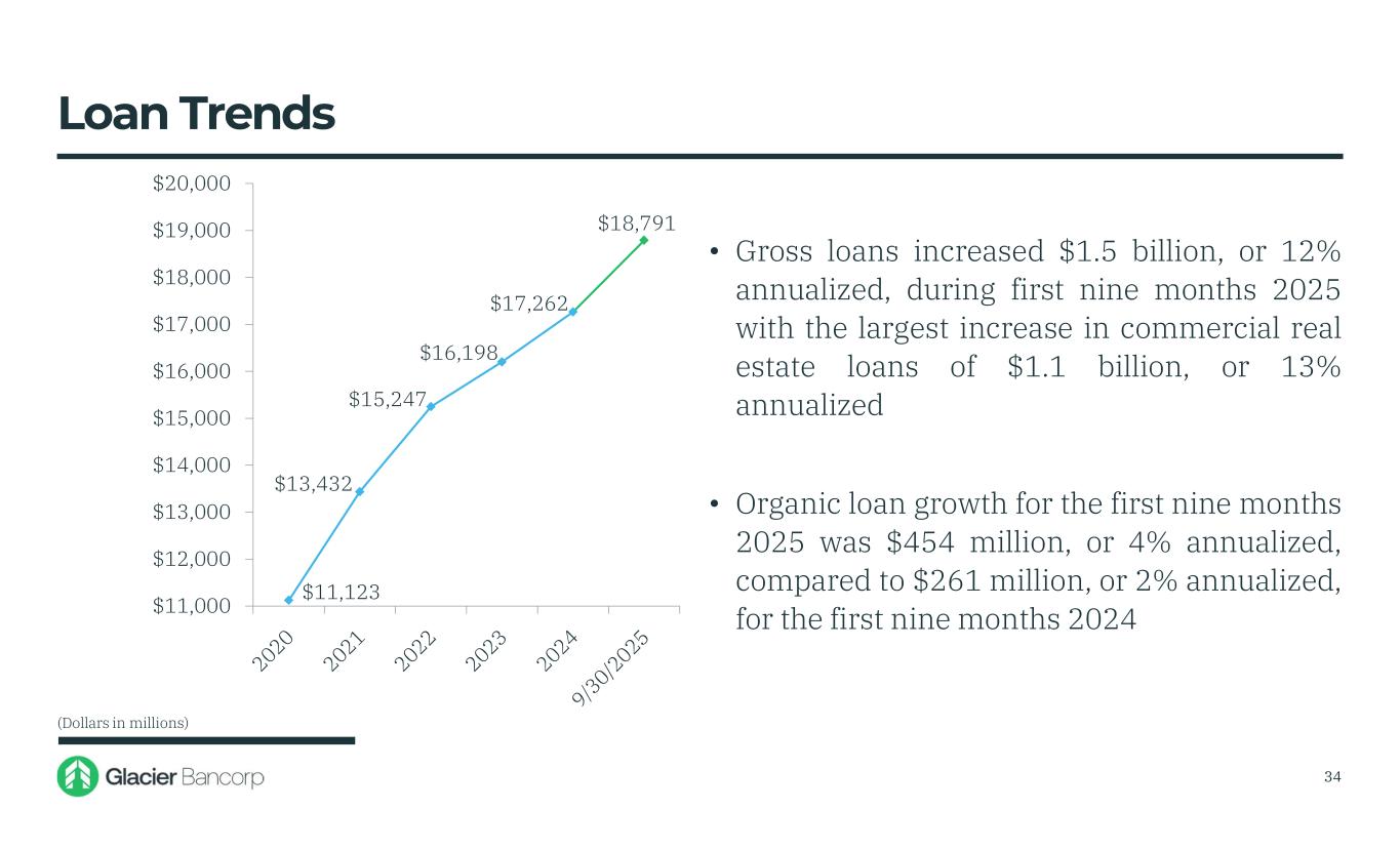 0.15% 0.09% 0.11% 1.22% 1.92% 1.75% 1.77% 0.53% 0.21% 0.58% 2.49% 3.17% 2.79% 0.00% 0.50% 1.00% 1.50% 2.00% 2.50% 3.00% 3.50% Glacier Peers • Interest-bearing deposit cost decreased to 1.77% at September 30, 2025, from 1.92% at December 31, 2024 due to market dynamics and the competitive rate environment • Total deposit cost decreased to 1.24% at September 30, 2025 from 1.34% at December 31, 2024 • Core deposits are a competitive advantage and will be a key driver of future performance Interest-Bearing Deposit Cost Relative to Peers Peer based on BHCPR as of 6/30/2025 33