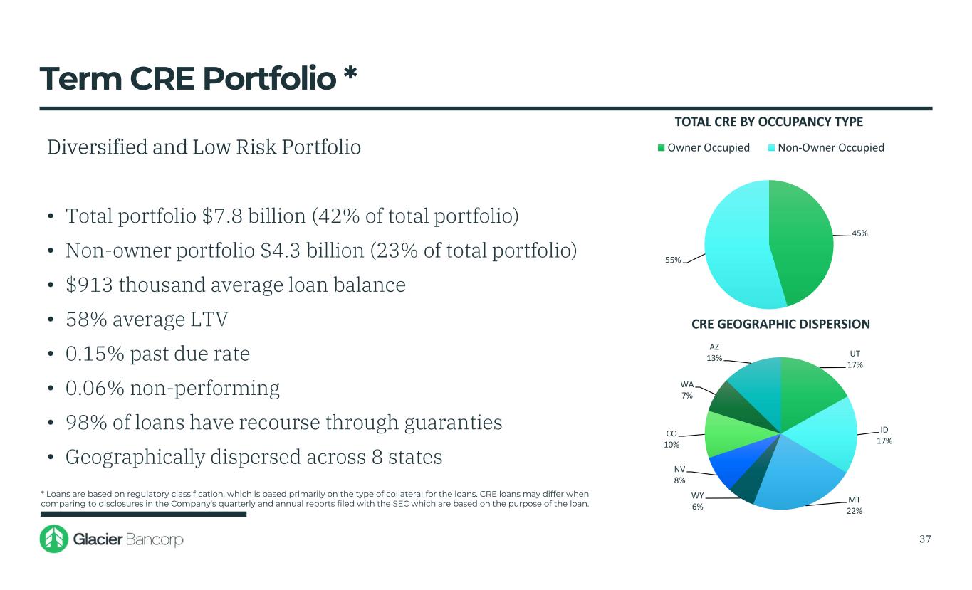 Montana 62% Idaho 22% Utah 2% Washington 1% Wyoming 9% Colorado 4% 12/31/2009 Montana 32% Idaho 16% Utah… Washington 9% Wyoming 7% Colorado 9% Arizona 9% Nevada 4% 9/30/2025 Geographic Loan Dispersion 36