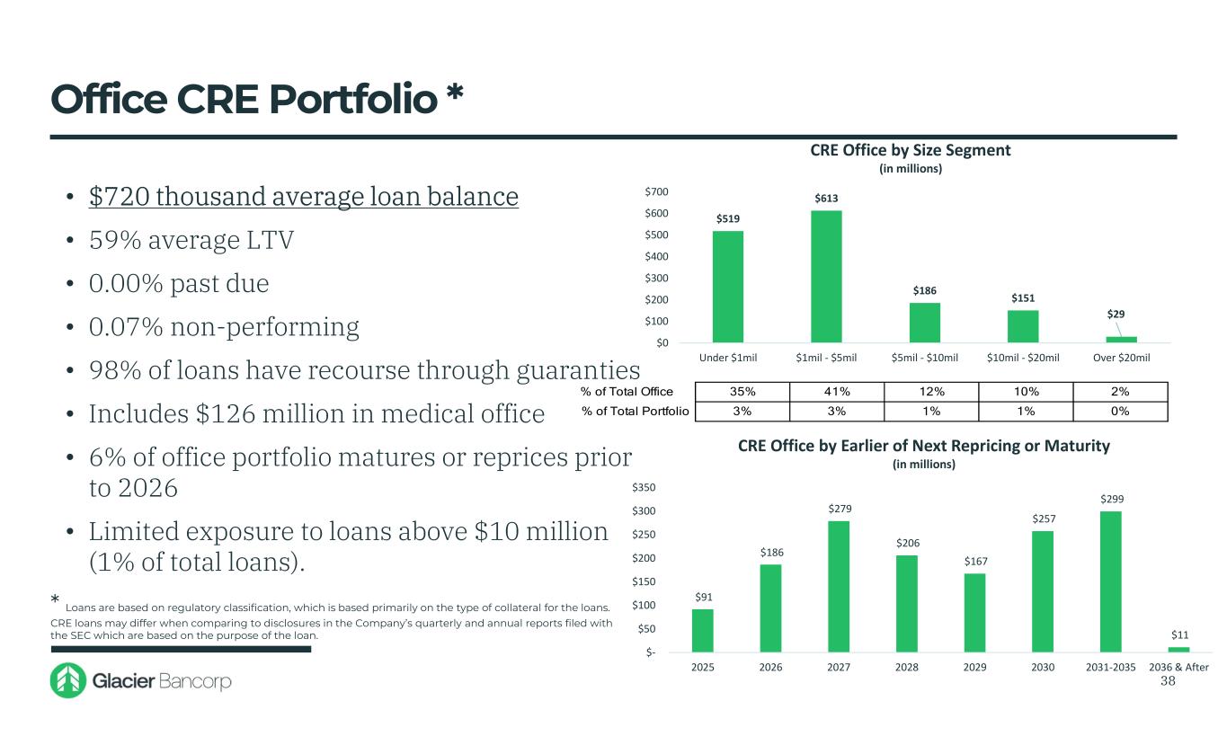 Term CRE Portfolio * Diversified and Low Risk Portfolio • Total portfolio $7.8 billion (42% of total portfolio) • Non-owner portfolio $4.3 billion (23% of total portfolio) • $913 thousand average loan balance • 58% average LTV • 0.15% past due rate • 0.06% non-performing • 98% of loans have recourse through guaranties • Geographically dispersed across 8 states 37 45% 55% TOTAL CRE BY OCCUPANCY TYPE Owner Occupied Non-Owner Occupied UT 17% ID 17% MT 22% WY 6% NV 8% CO 10% WA 7% AZ 13% CRE GEOGRAPHIC DISPERSION * Loans are based on regulatory classification, which is based primarily on the type of collateral for the loans. CRE loans may differ when comparing to disclosures in the Company’s quarterly and annual reports filed with the SEC which are based on the purpose of the loan.