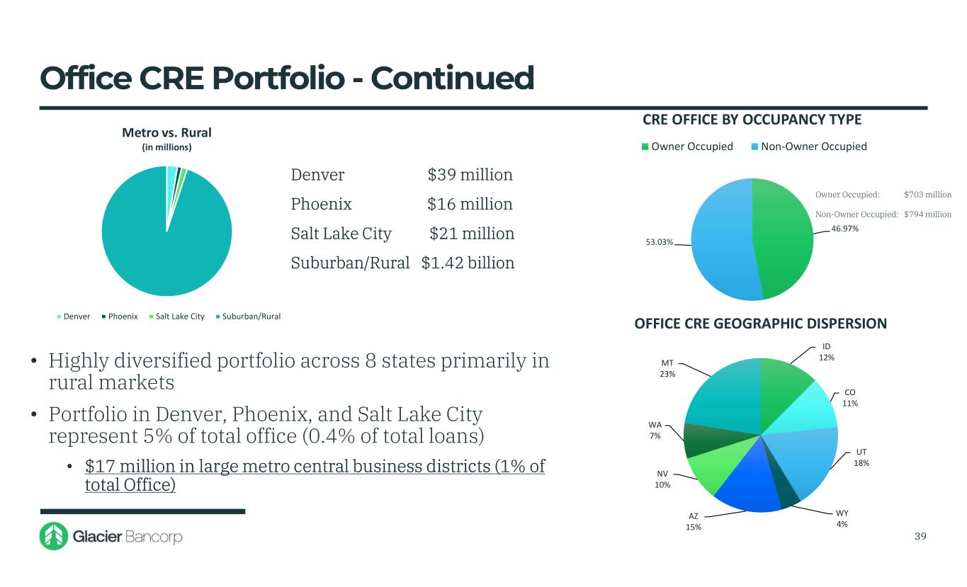 Office CRE Portfolio * • $720 thousand average loan balance • 59% average LTV • 0.00% past due • 0.07% non-performing • 98% of loans have recourse through guaranties • Includes $126 million in medical office • 6% of office portfolio matures or reprices prior to 2026 • Limited exposure to loans above $10 million (1% of total loans). 38 $519 $613 $186 $151 $29 $0 $100 $200 $300 $400 $500 $600 $700 Under $1mil $1mil - $5mil $5mil - $10mil $10mil - $20mil Over $20mil CRE Office by Size Segment (in millions) % of Total Office 35% 41% 12% 10% 2% % of Total Portfolio 3% 3% 1% 1% 0% $91 $186 $279 $206 $167 $257 $299 $11 $- $50 $100 $150 $200 $250 $300 $350 2025 2026 2027 2028 2029 2030 2031-2035 2036 & After CRE Office by Earlier of Next Repricing or Maturity (in millions) * Loans are based on regulatory classification, which is based primarily on the type of collateral for the loans. CRE loans may differ when comparing to disclosures in the Company’s quarterly and annual reports filed with the SEC which are based on the purpose of the loan.