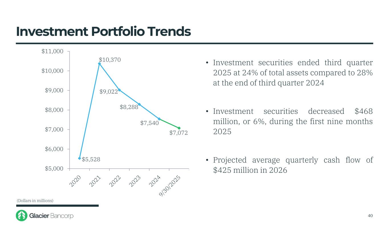 $5,528 $10,370 $9,022 $8,288 $7,540 $7,072 $5,000 $6,000 $7,000 $8,000 $9,000 $10,000 $11,000 • Investment securities ended third quarter 2025 at 24% of total assets compared to 28% at the end of third quarter 2024 • Investment securities decreased $468 million, or 6%, during the first nine months 2025 • Projected average quarterly cash flow of $425 million in 2026 Investment Portfolio Trends (Dollars in millions) 40