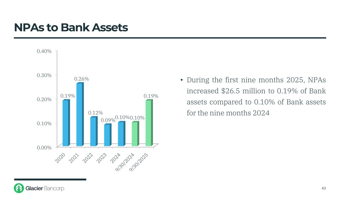 0.00% 0.10% 0.20% 0.30% 0.40% 0.19% 0.26% 0.09%0.10%0.10% 0.19% • During the first nine months 2025, NPAs increased $26.5 million to 0.19% of Bank assets compared to 0.10% of Bank assets for the nine months 2024 NPAs to Bank Assets 0.12% 43
