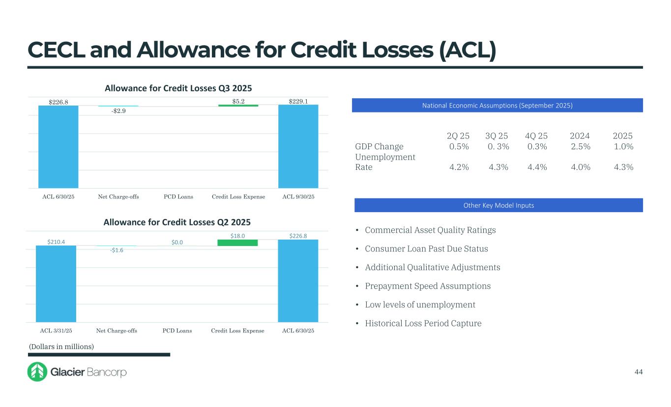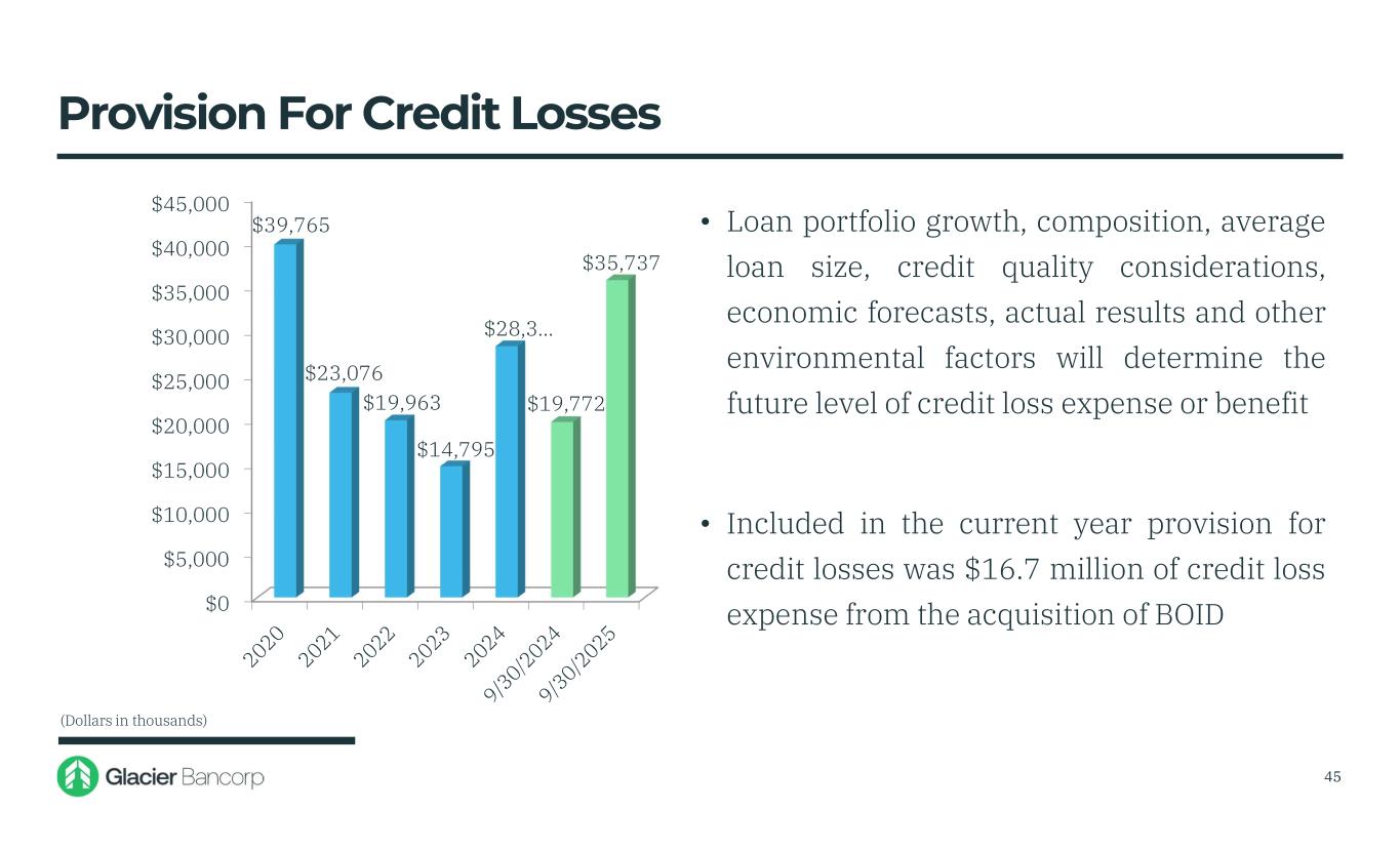 CECL and Allowance for Credit Losses (ACL) • Commercial Asset Quality Ratings • Consumer Loan Past Due Status • Additional Qualitative Adjustments • Prepayment Speed Assumptions • Low levels of unemployment • Historical Loss Period Capture (Dollars in millions) Other Key Model Inputs National Economic Assumptions (September 2025) 202520244Q 25 3Q 25 2Q 25 1.0%2.5%0.3%0. 3%0.5%GDP Change 4.3%4.0%4.4%4.3%4.2% Unemployment Rate 1.19% of Total Loans 1.19% of Total Loans 44 $210.4 -$1.6 $0.0 $18.0 $226.8 ACL 3/31/25 Net Charge-offs PCD Loans Credit Loss Expense ACL 6/30/25 Allowance for Credit Losses Q2 2025 $226.8 -$2.9 $5.2 $229.1 ACL 6/30/25 Net Charge-offs PCD Loans Credit Loss Expense ACL 9/30/25 Allowance for Credit Losses Q3 2025