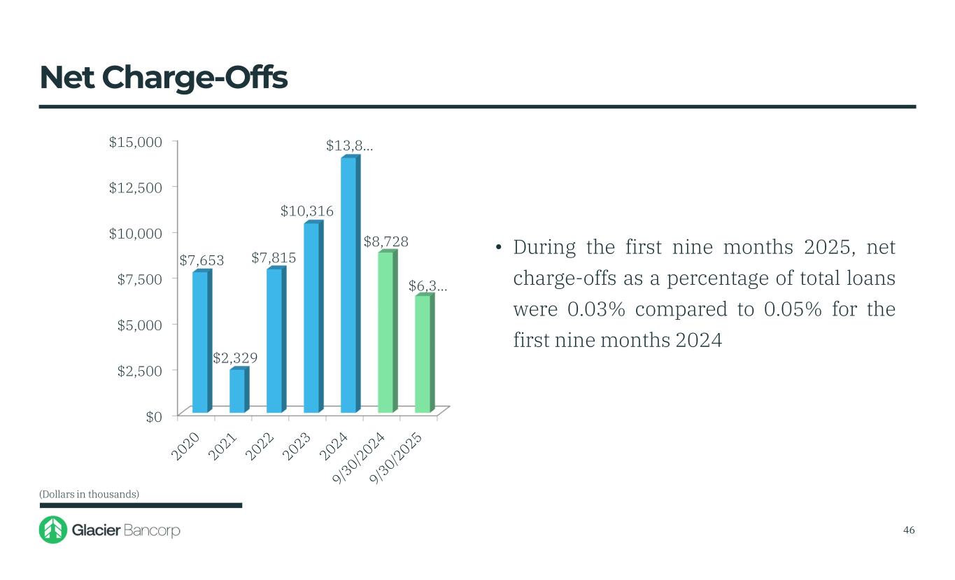 $0 $5,000 $10,000 $15,000 $20,000 $25,000 $30,000 $35,000 $40,000 $45,000 $39,765 $23,076 $19,963 $14,795 $28,3… $19,772 $35,737 • Loan portfolio growth, composition, average loan size, credit quality considerations, economic forecasts, actual results and other environmental factors will determine the future level of credit loss expense or benefit • Included in the current year provision for credit losses was $16.7 million of credit loss expense from the acquisition of BOID Provision For Credit Losses (Dollars in thousands) 45