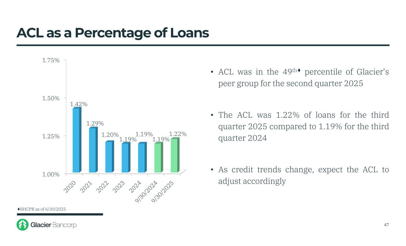 1.00% 1.25% 1.50% 1.75% 1.42% 1.29% 1.20% 1.19% 1.19% 1.19% 1.22% • ACL was in the 49th percentile of Glacier’s peer group for the second quarter 2025 • The ACL was 1.22% of loans for the third quarter 2025 compared to 1.19% for the third quarter 2024 • As credit trends change, expect the ACL to adjust accordingly ACL as a Percentage of Loans BHCPR as of 6/30/2025 47