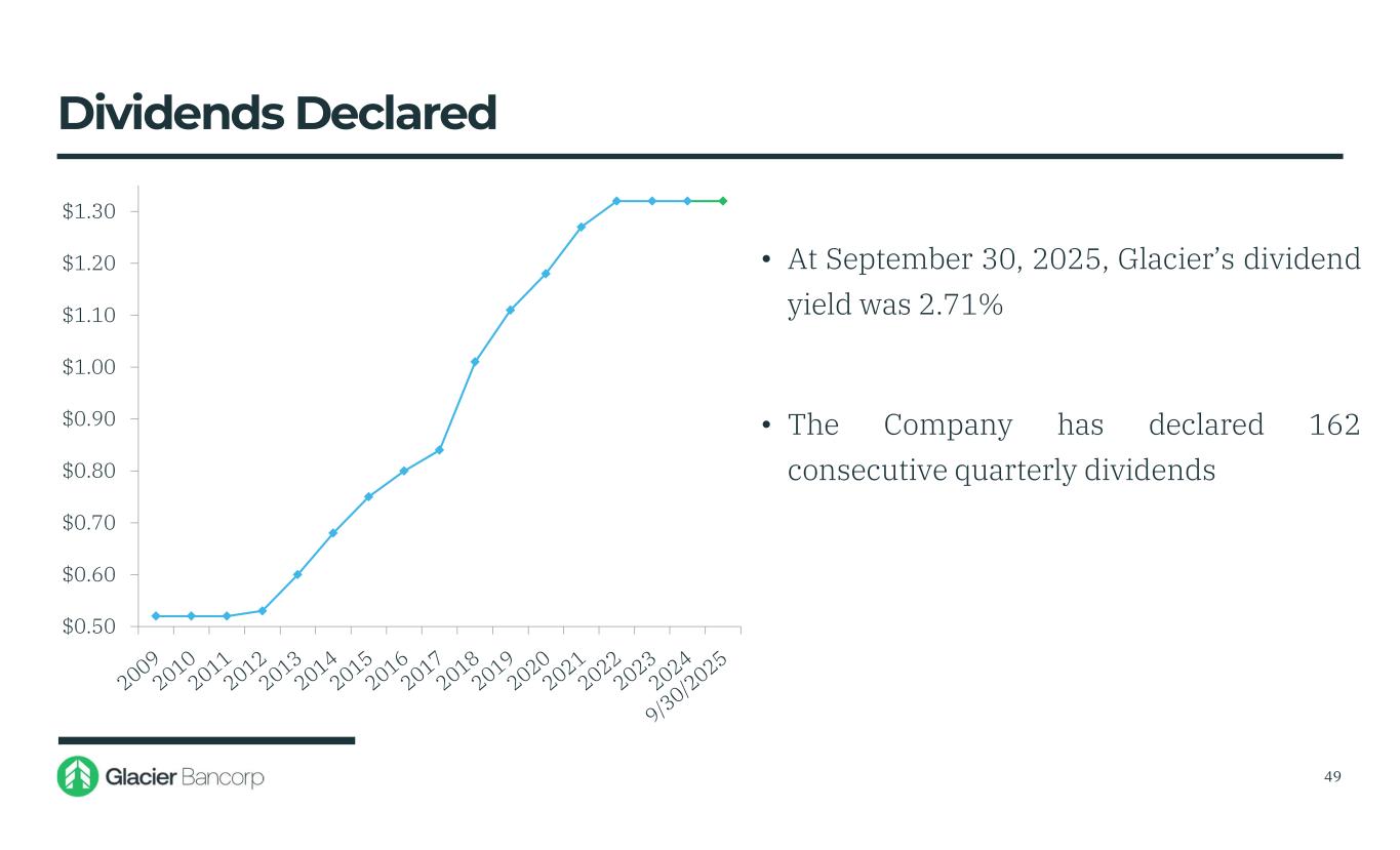 $0.50 $0.60 $0.70 $0.80 $0.90 $1.00 $1.10 $1.20 $1.30 • At September 30, 2025, Glacier’s dividend yield was 2.71% • The Company has declared 162 consecutive quarterly dividends Dividends Declared 49